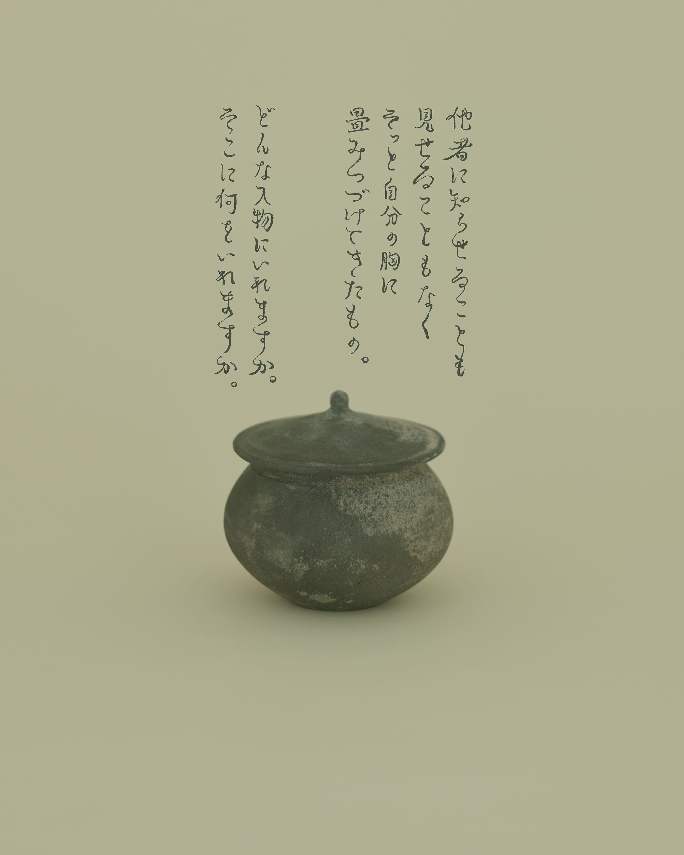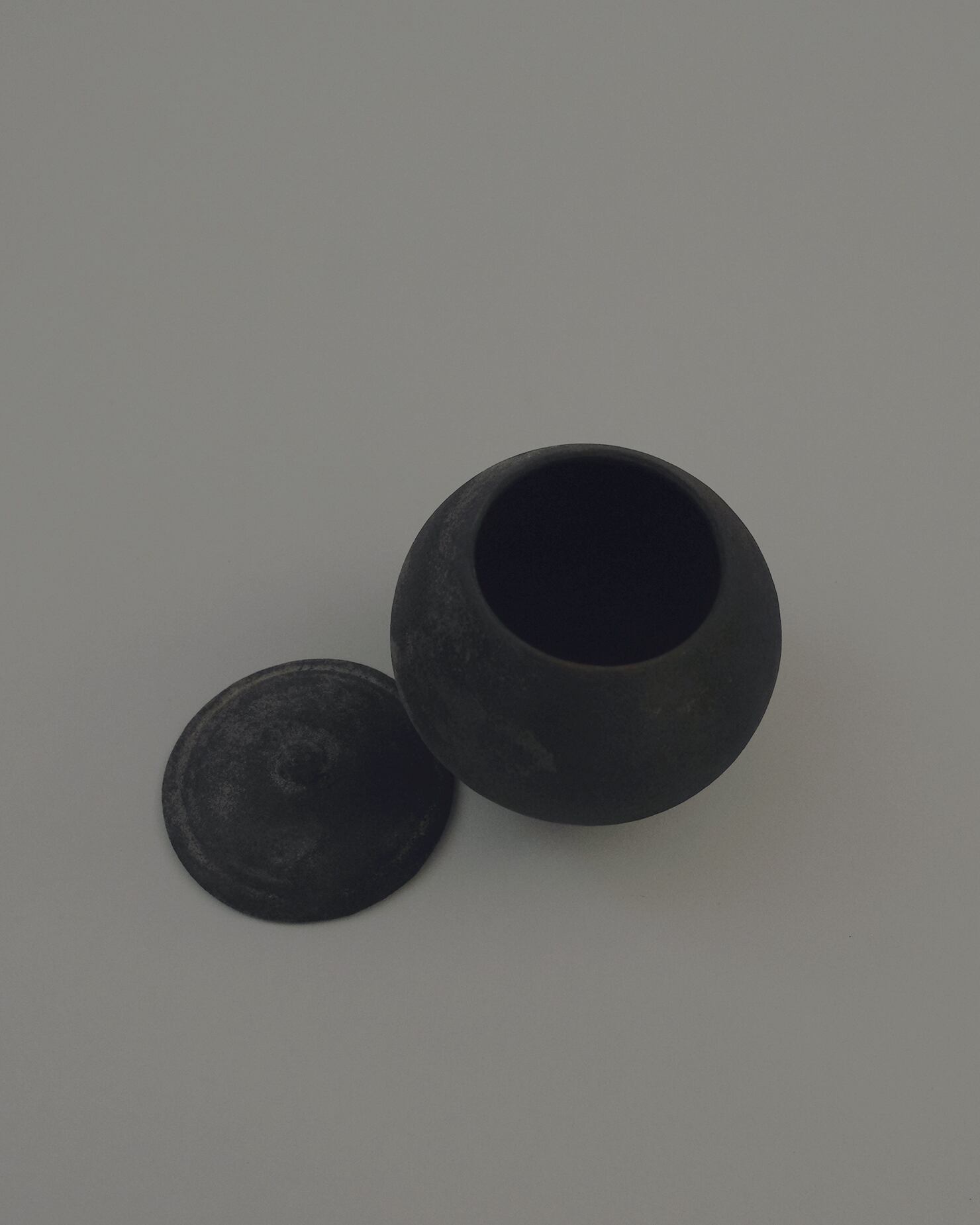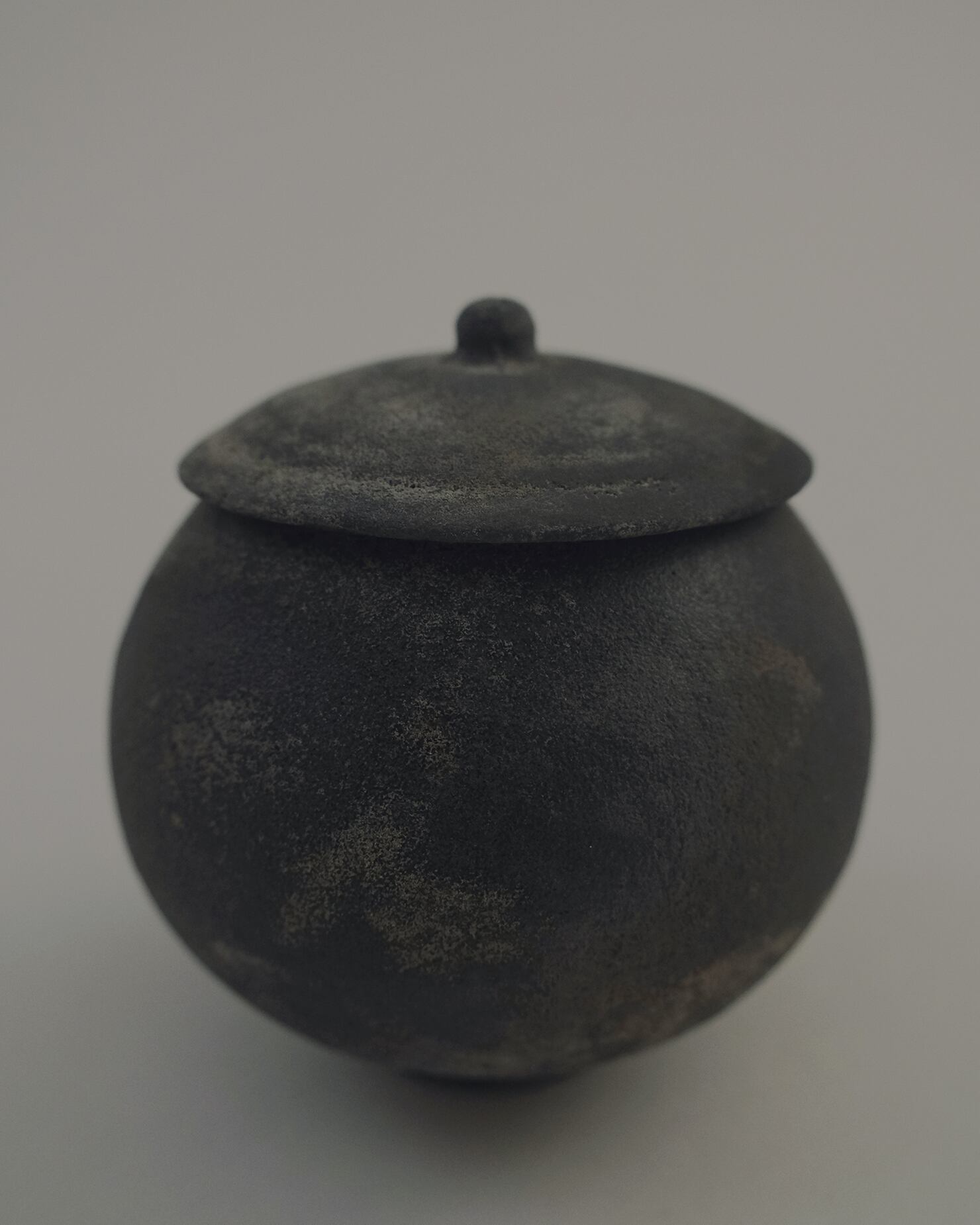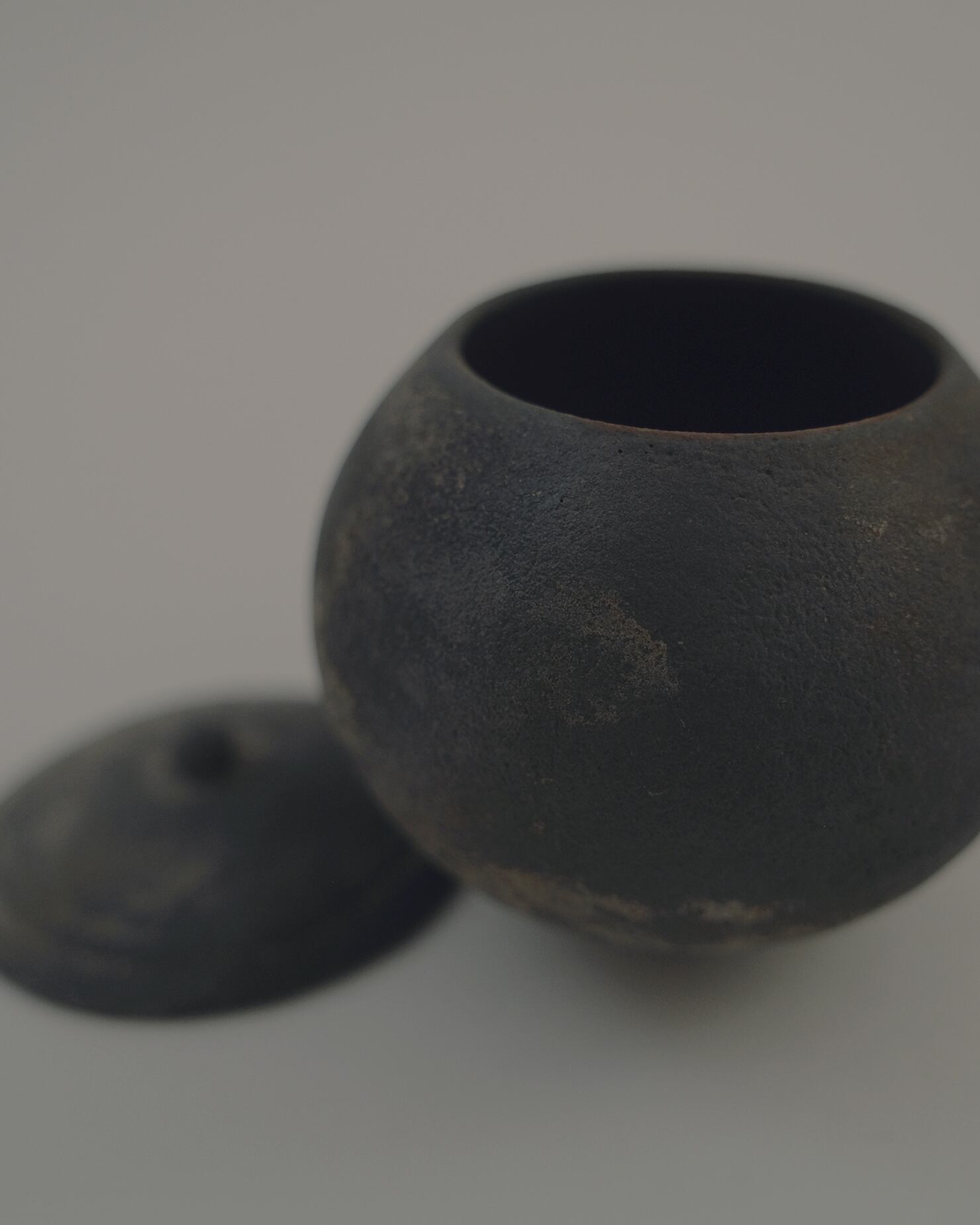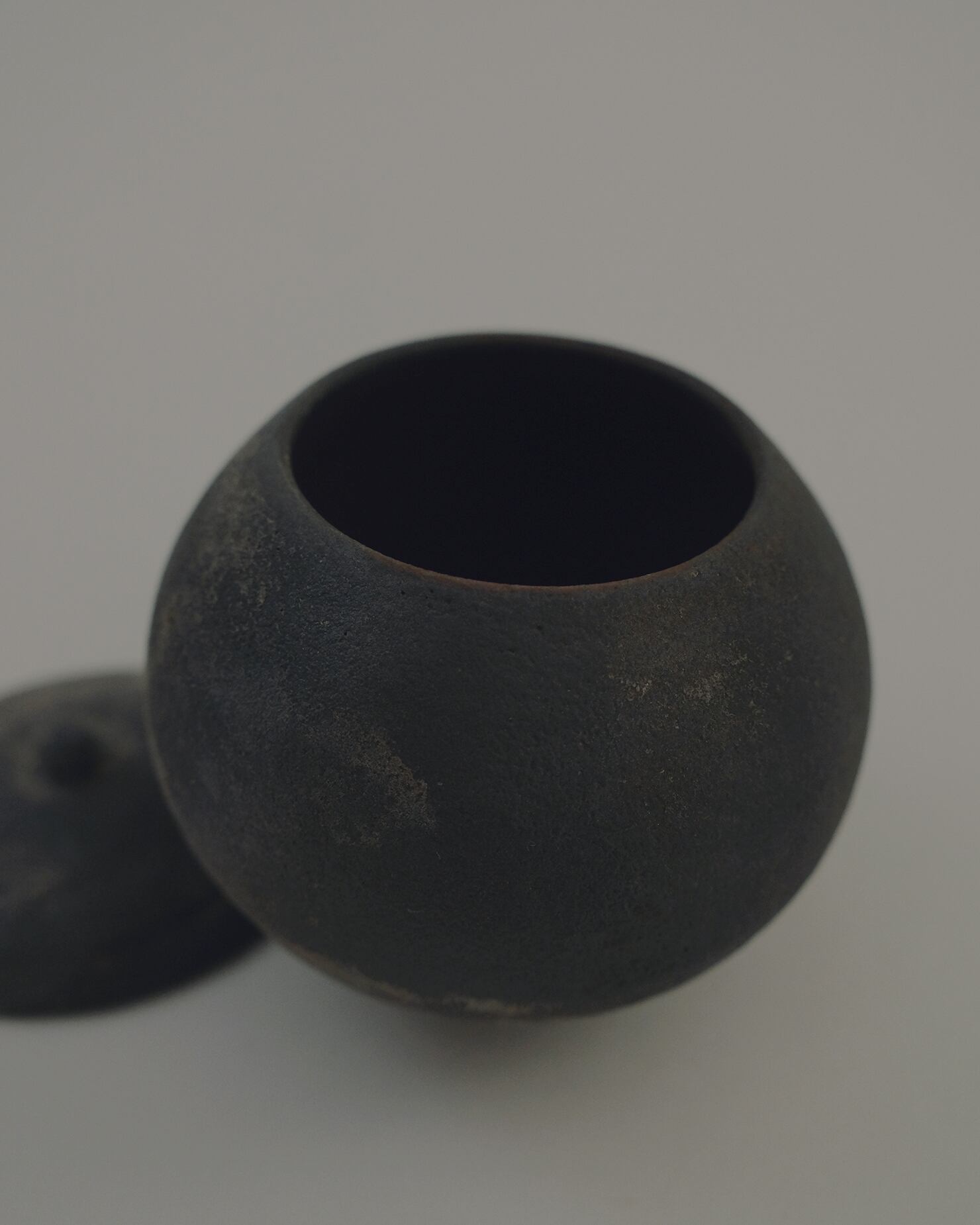鏡原愛莉の「しまい匣」は、炭化がつくる黒の陶で作られます。その黒は白から黒までの色の幅の中を揺らぎ、釜の中で自然に作られます。焼けてはじめて現れる色ムラは、黒がさまざまな色を含むことを感じさせ、黒の色の豊かさを改めて知らされます。