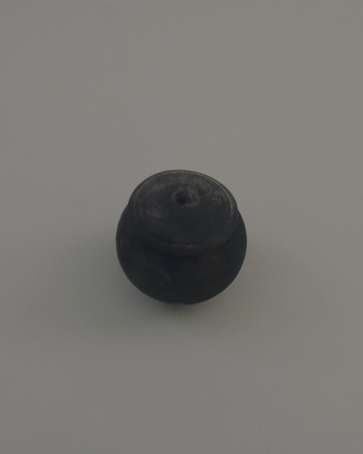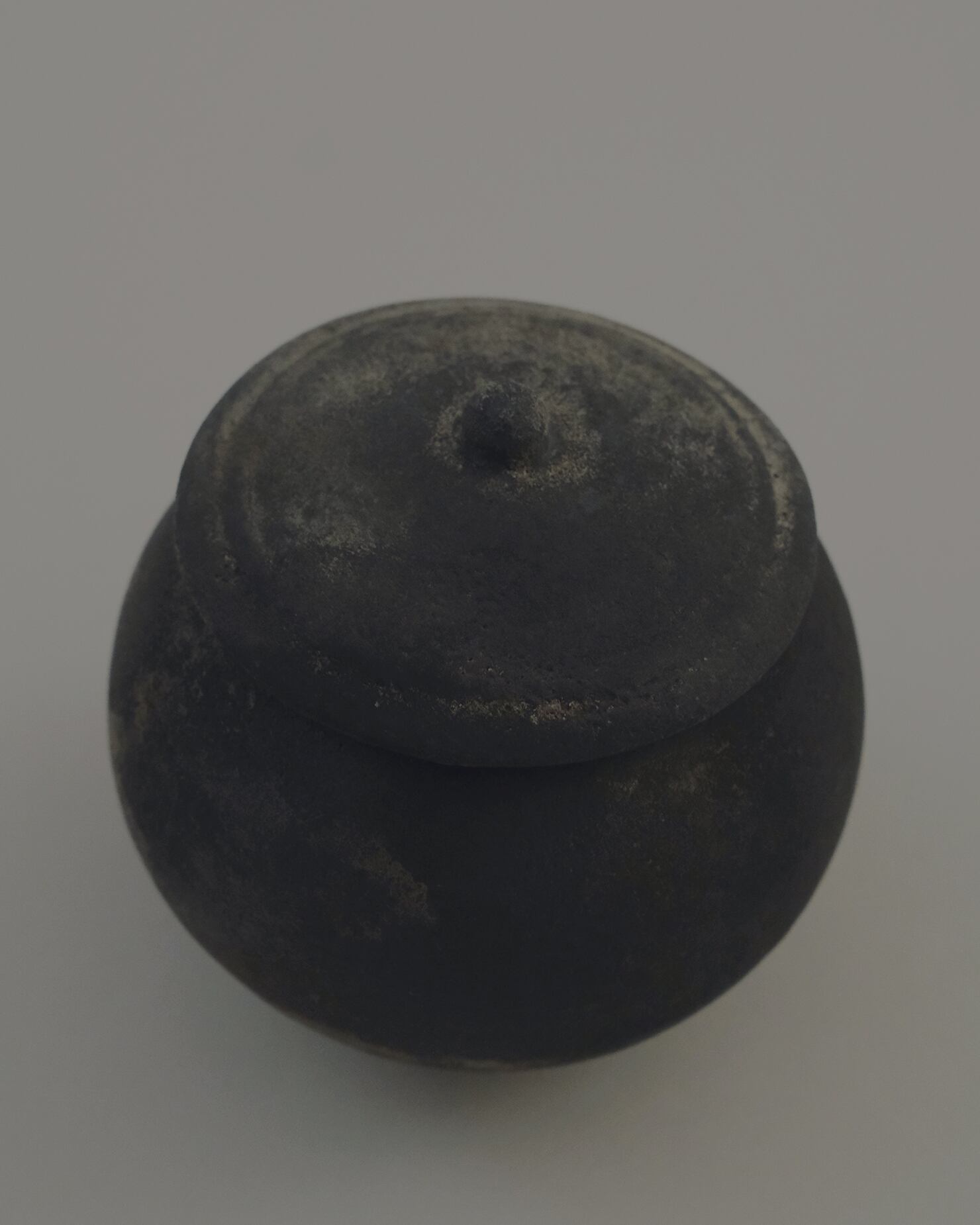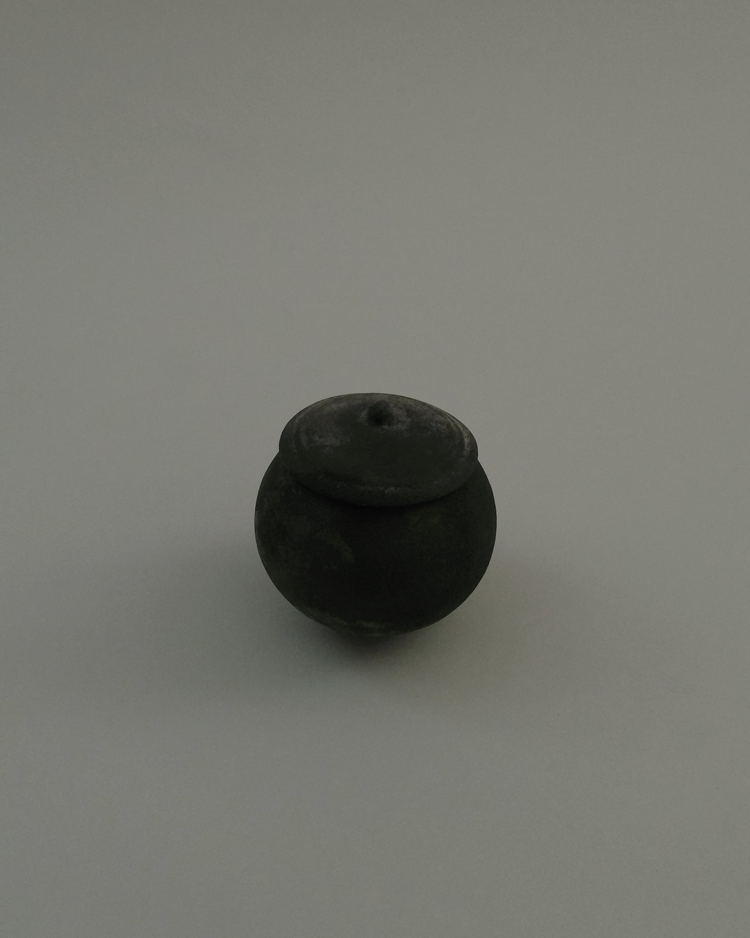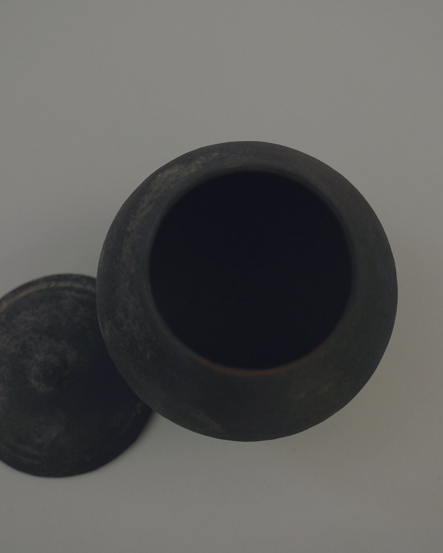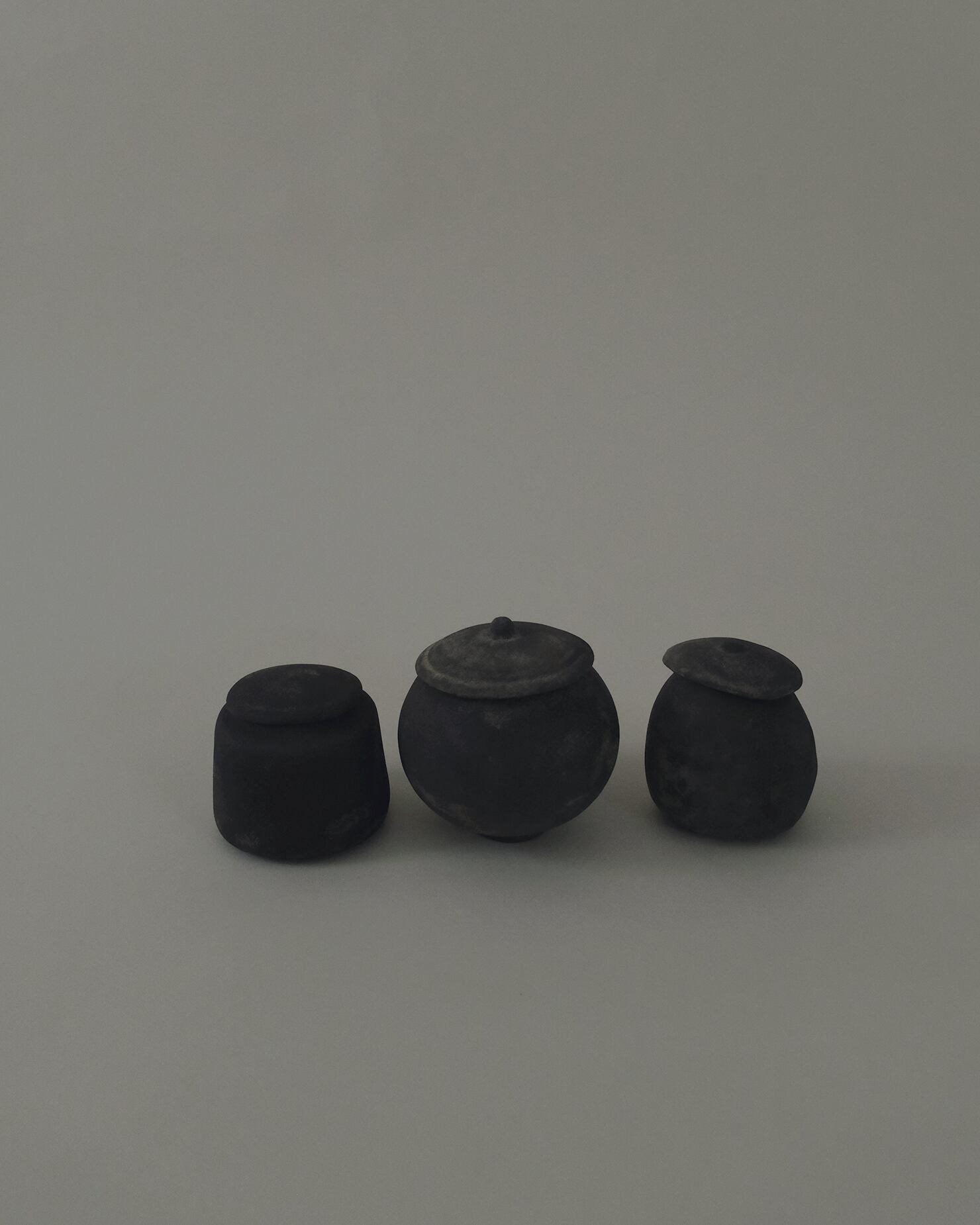鏡原愛莉の「しまい匣」は、炭化がつくる黒の陶で作られます。その黒は白から黒までの色の幅の中を揺らぎ、釜の中で自然に作られます。焼けてはじめて現れる色ムラは、黒がさまざまな色を含むことを感じさせ、黒の色の豊かさを改めて知らされます。