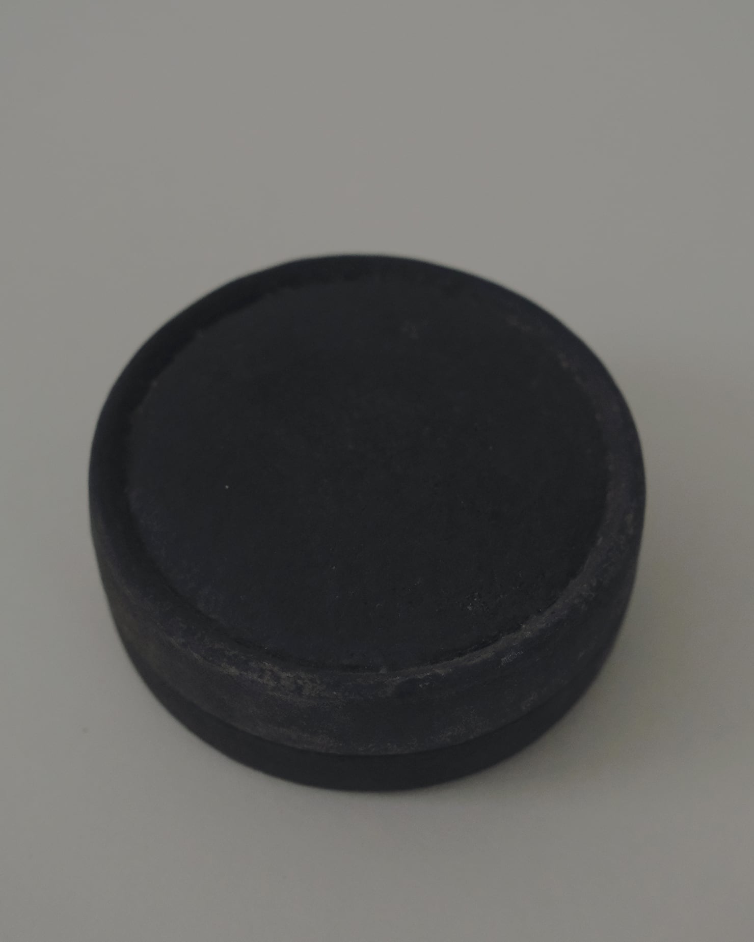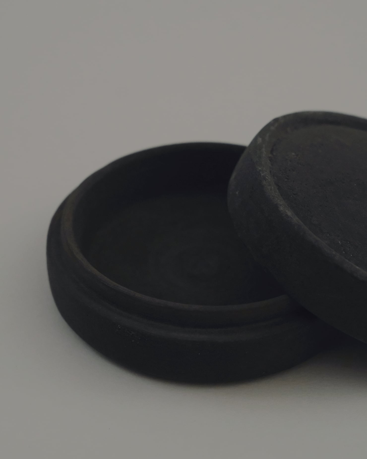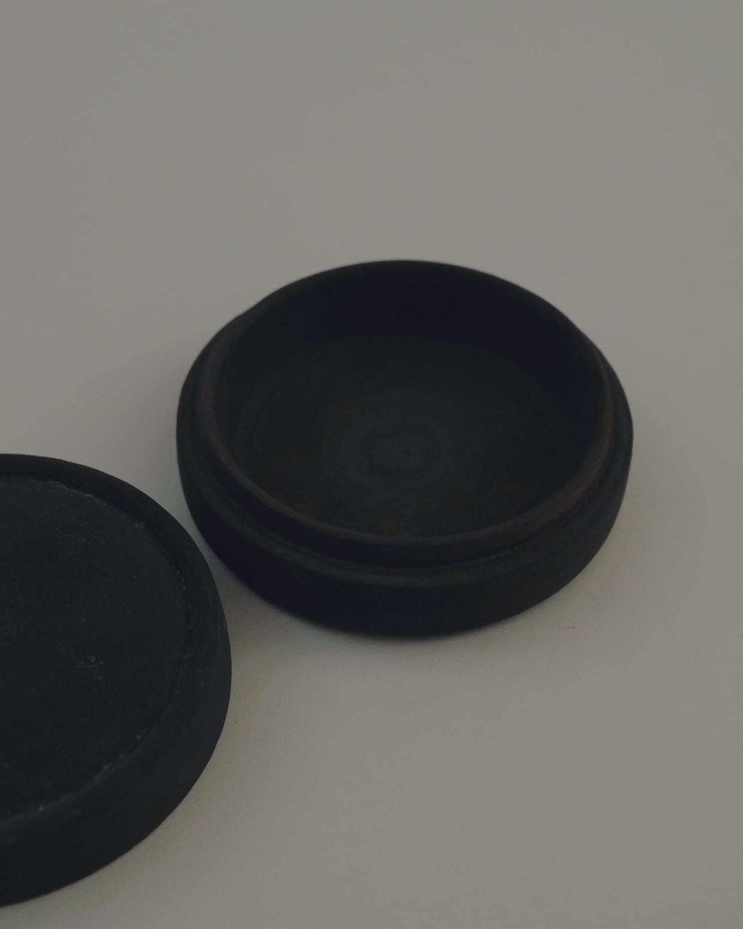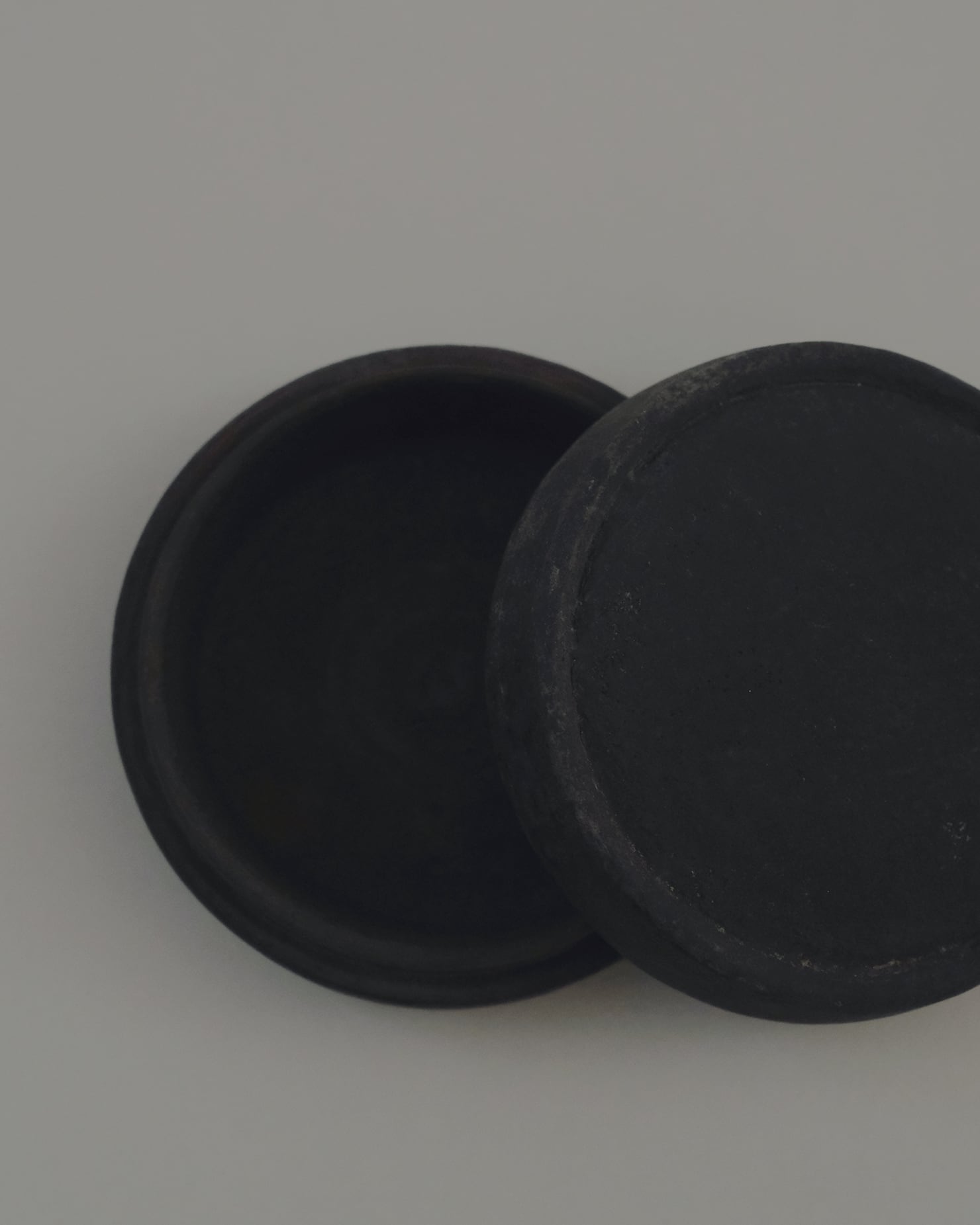 鏡原愛莉の「しまい匣」は、炭化がつくる黒の陶で作られます。その黒は白から黒までの色の幅の中を揺らぎ、釜の中で自然に作られます。焼けてはじめて現れる色ムラは、黒がさまざまな色を含むことを感じさせ、黒の色の豊かさを改めて知らされます。
