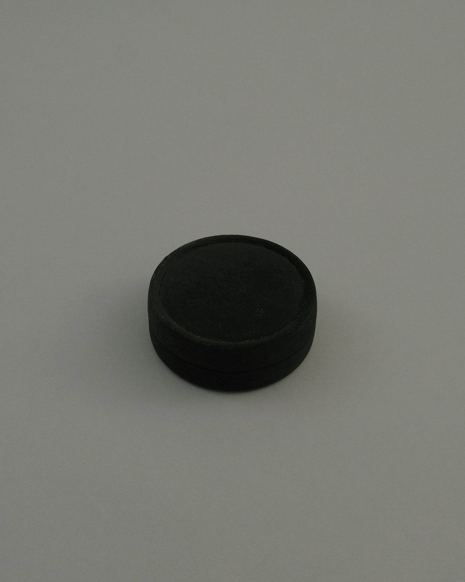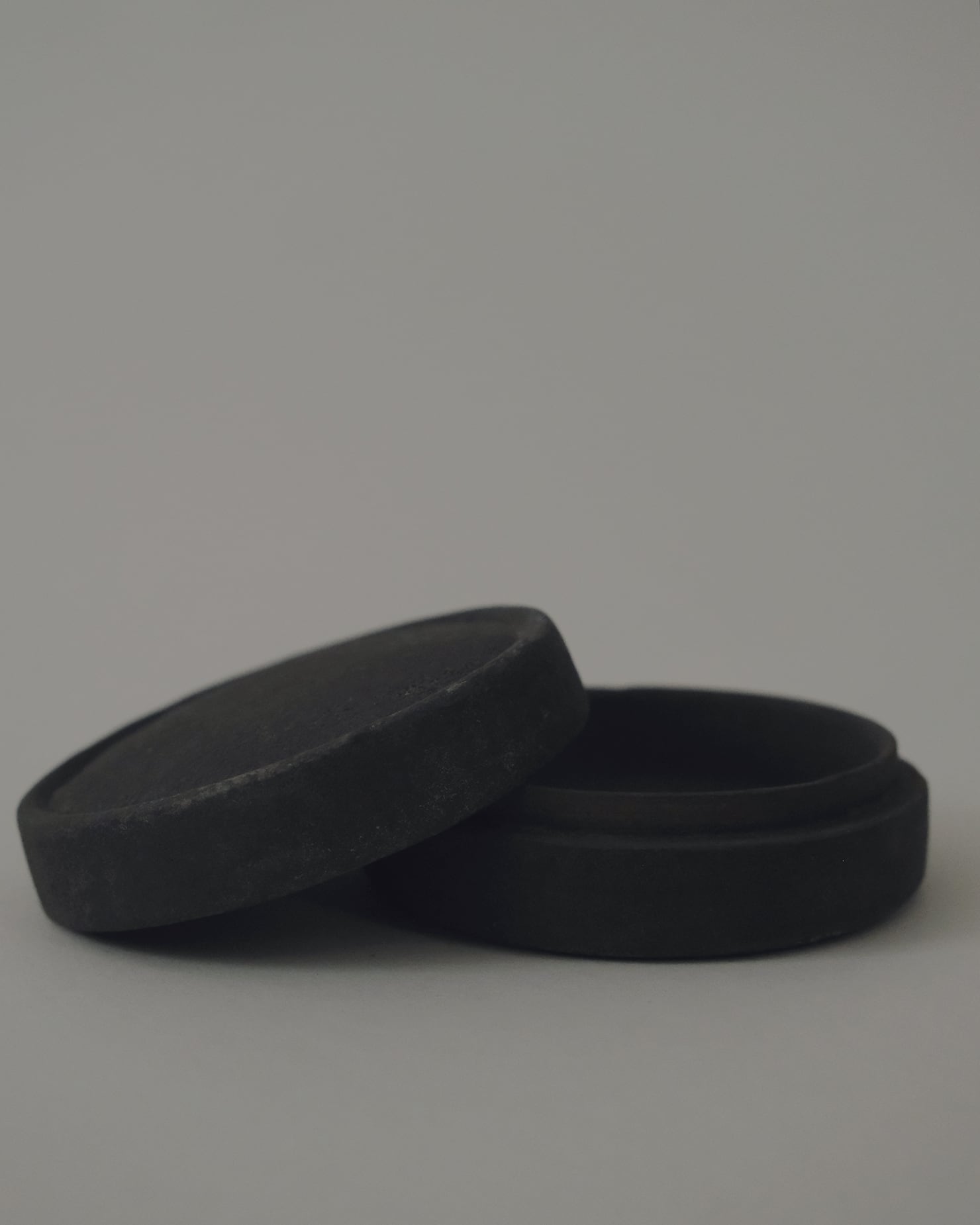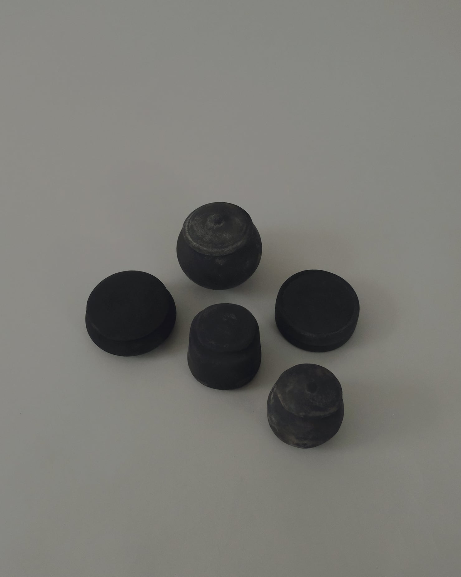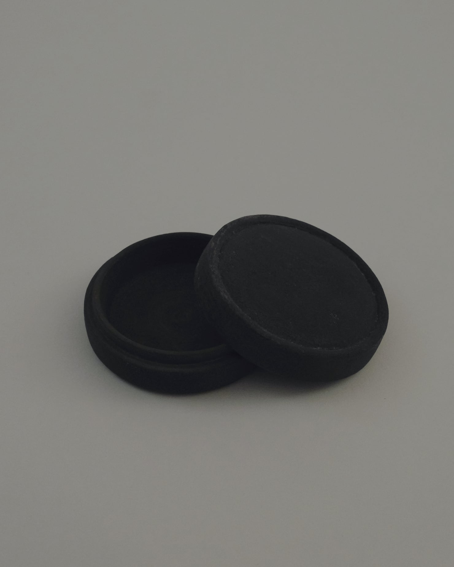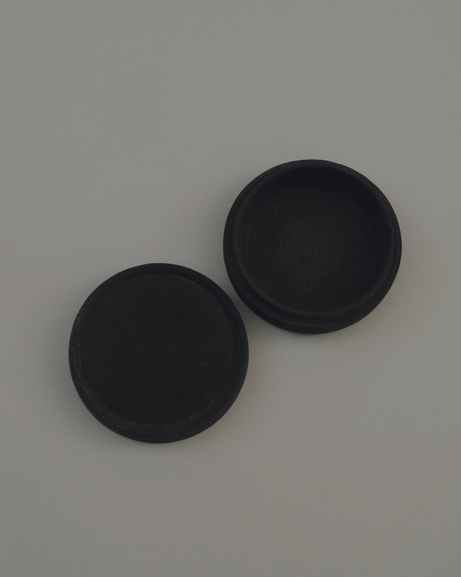 鏡原愛莉の「しまい匣」は、炭化がつくる黒の陶で作られます。その黒は白から黒までの色の幅の中を揺らぎ、釜の中で自然に作られます。焼けてはじめて現れる色ムラは、黒がさまざまな色を含むことを感じさせ、黒の色の豊かさを改めて知らされます。