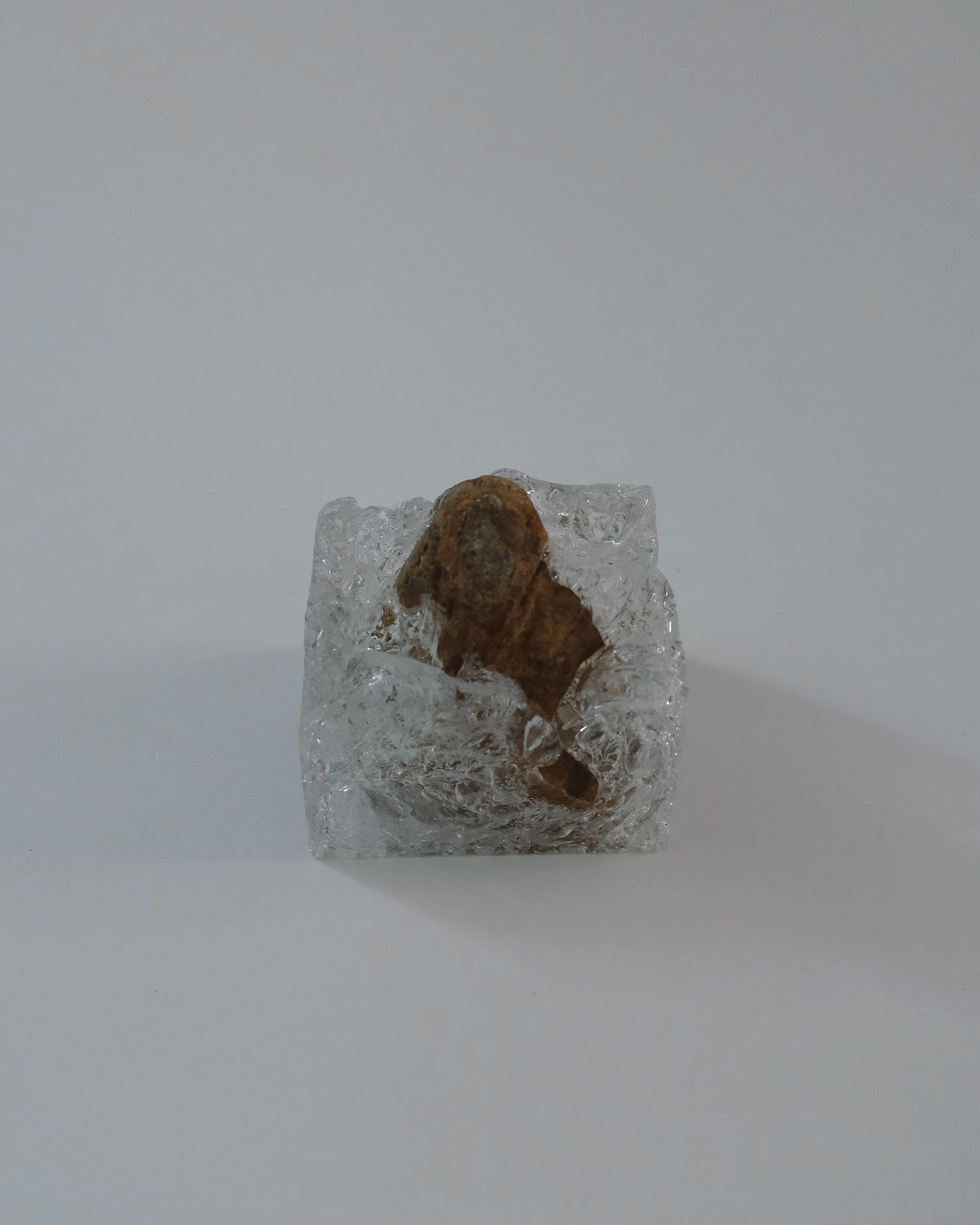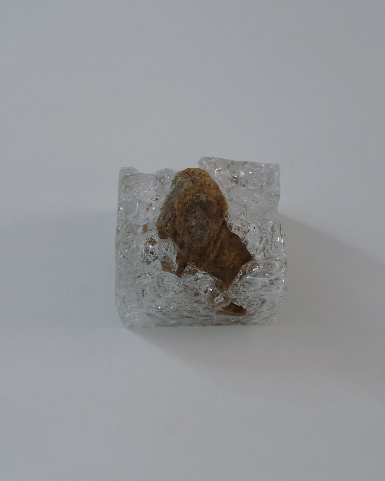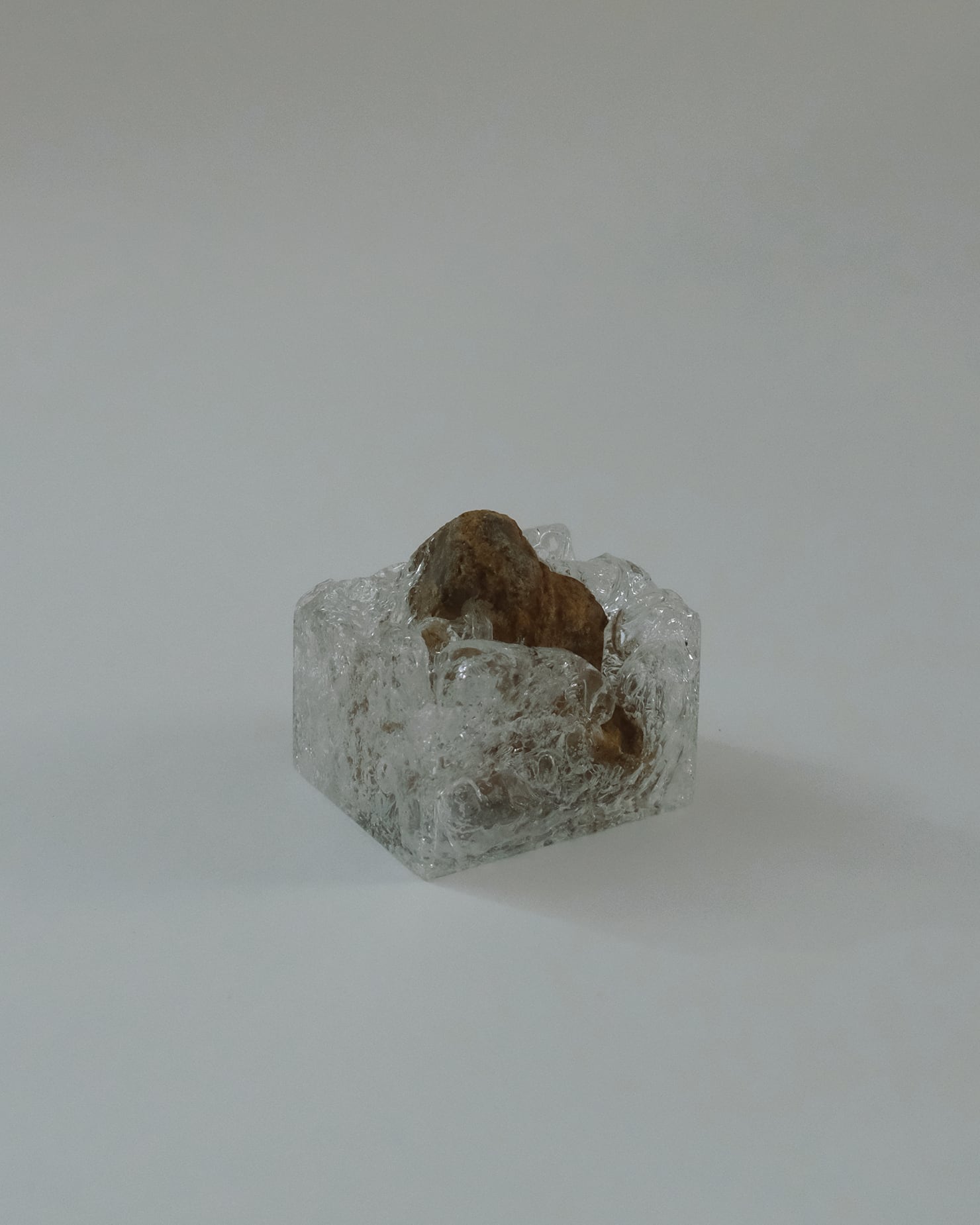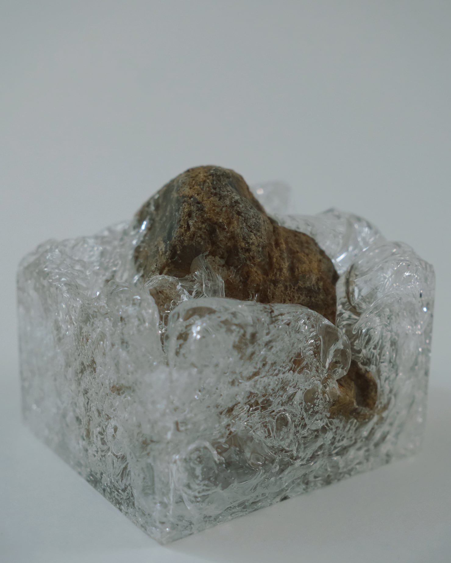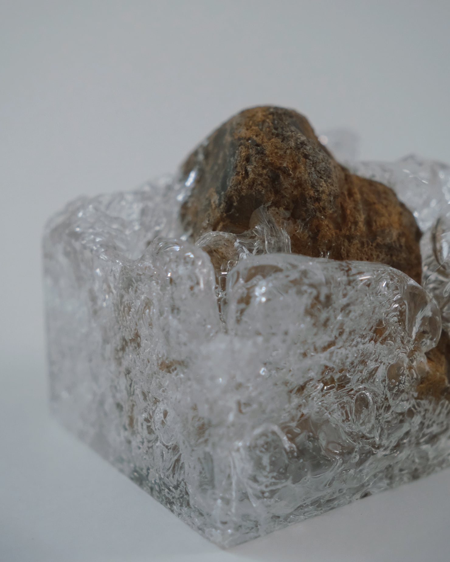 老の最大の要因にもなる空気の気泡を含んだアクリルと老ない素材とされる石が重なり、その矛盾がオブジェクトとしての魅力を作っているのかもしれません。