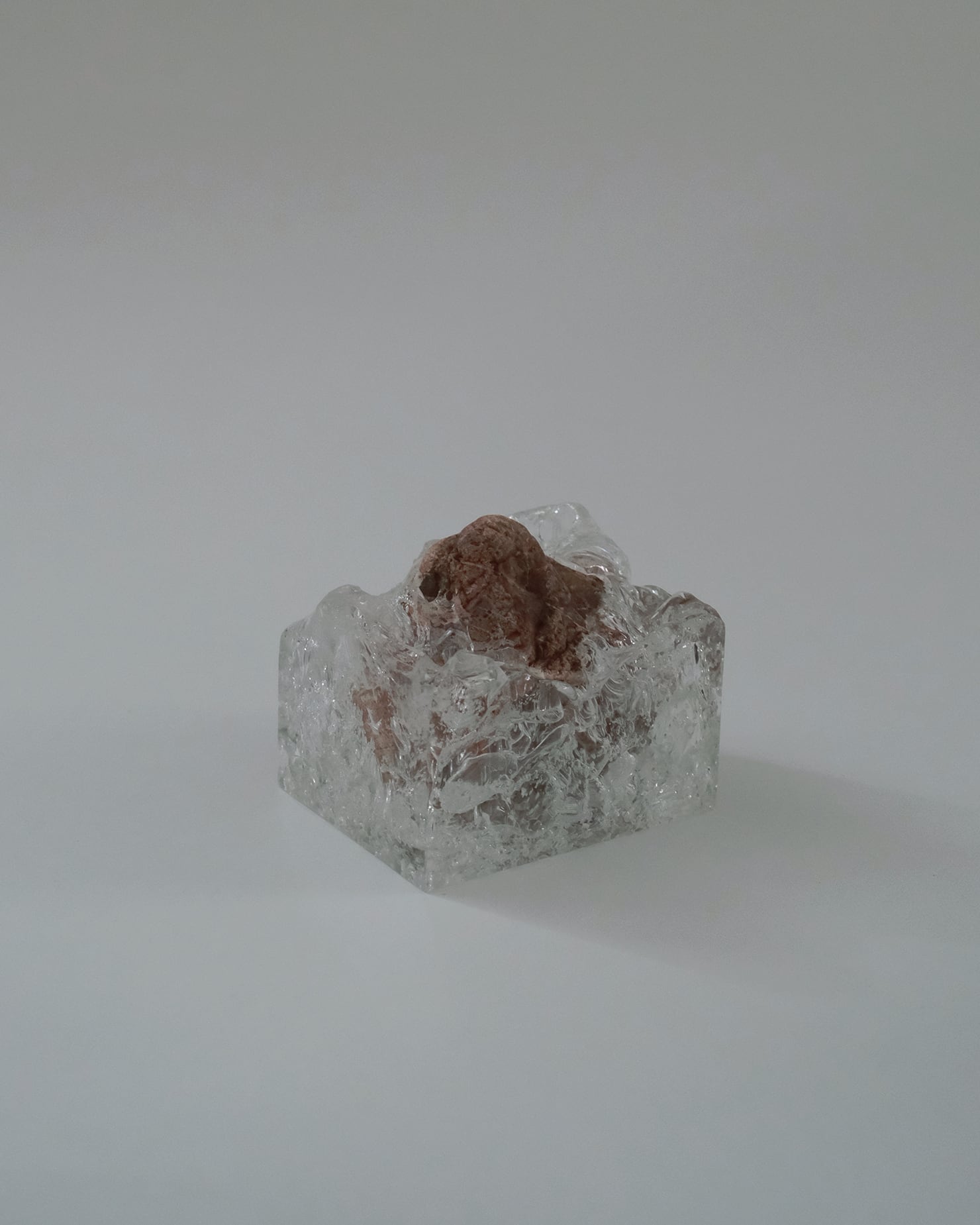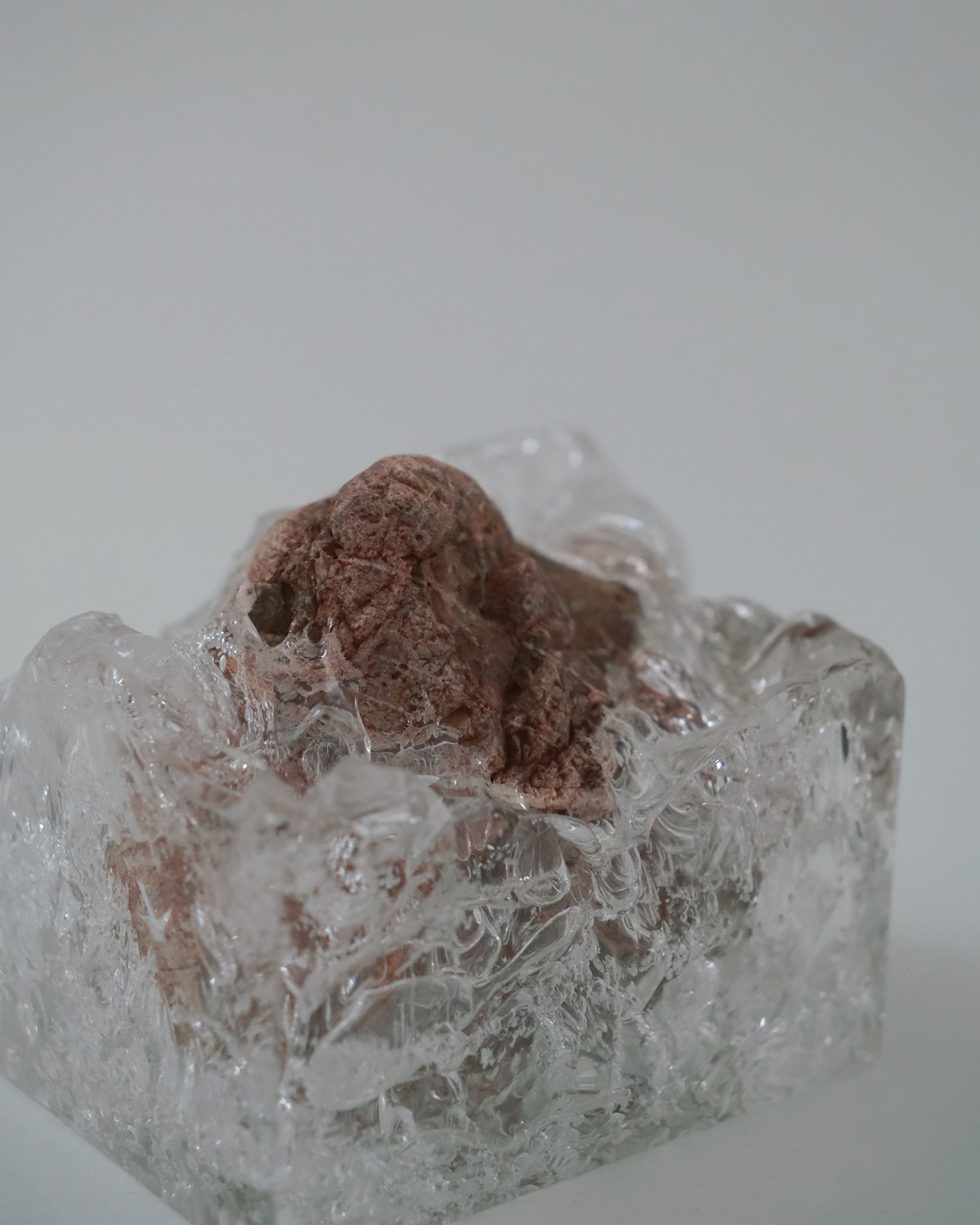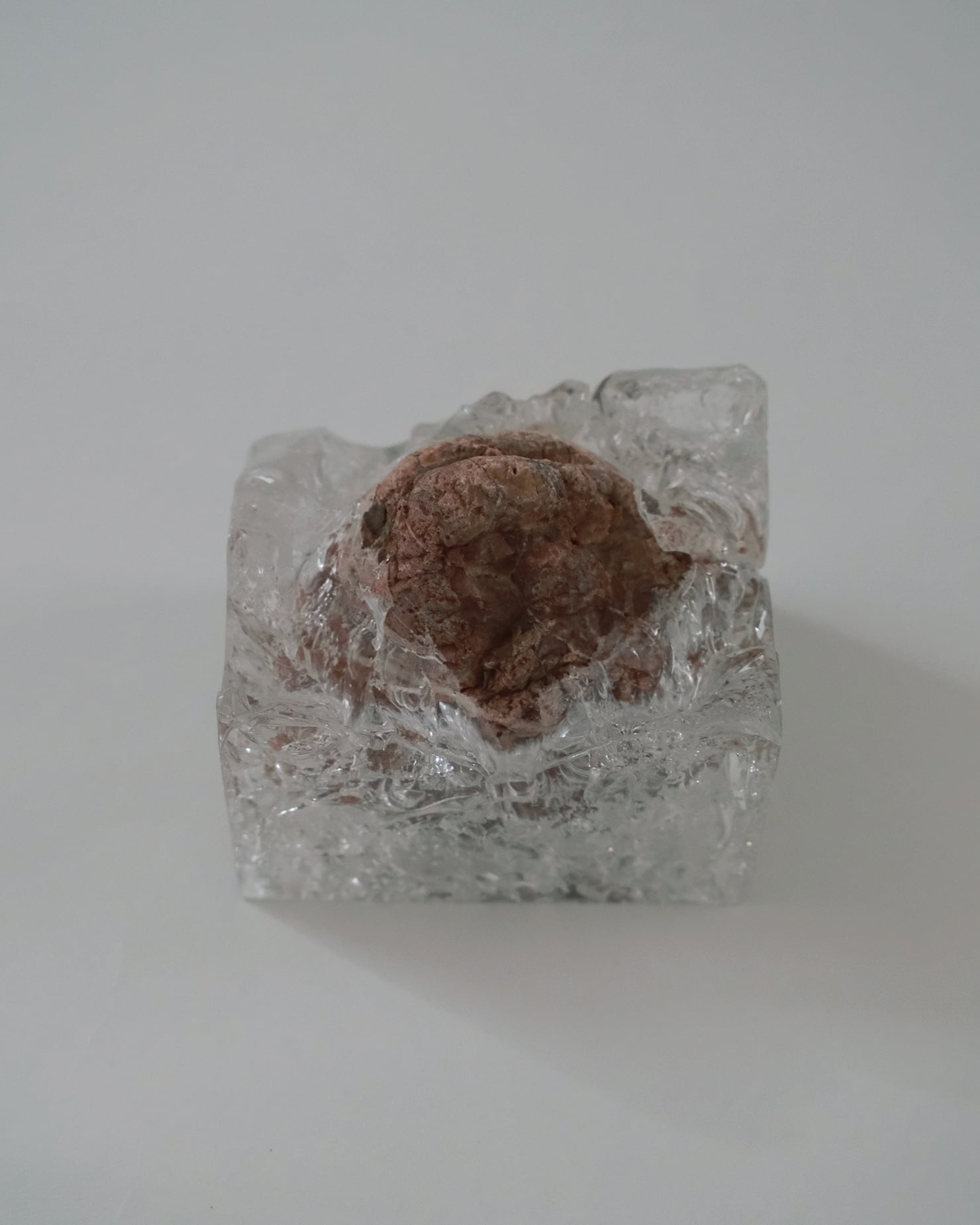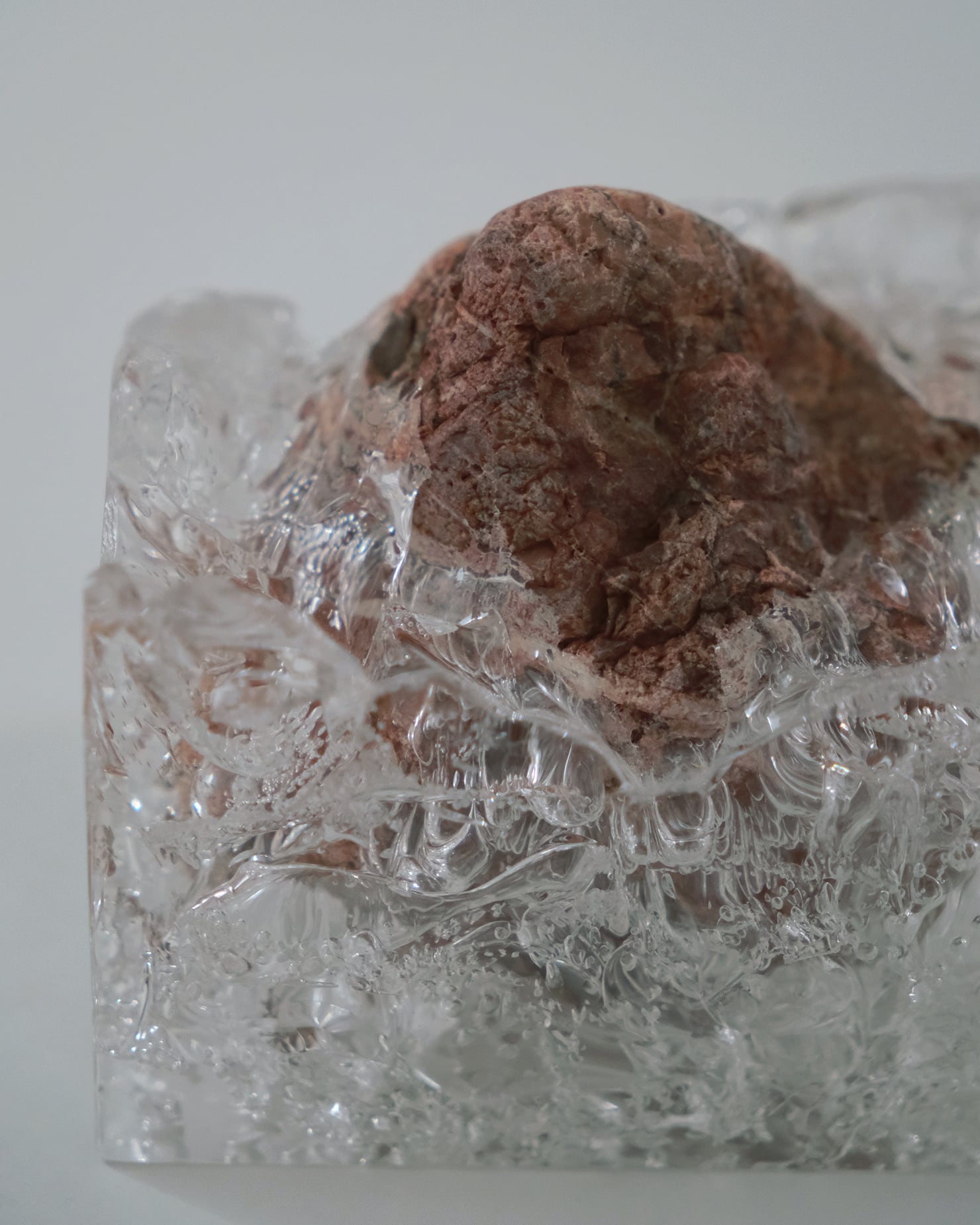 老の最大の要因にもなる空気の気泡を含んだアクリルと老ない素材とされる石が重なり、その矛盾がオブジェクトとしての魅力を作っているのかもしれません。