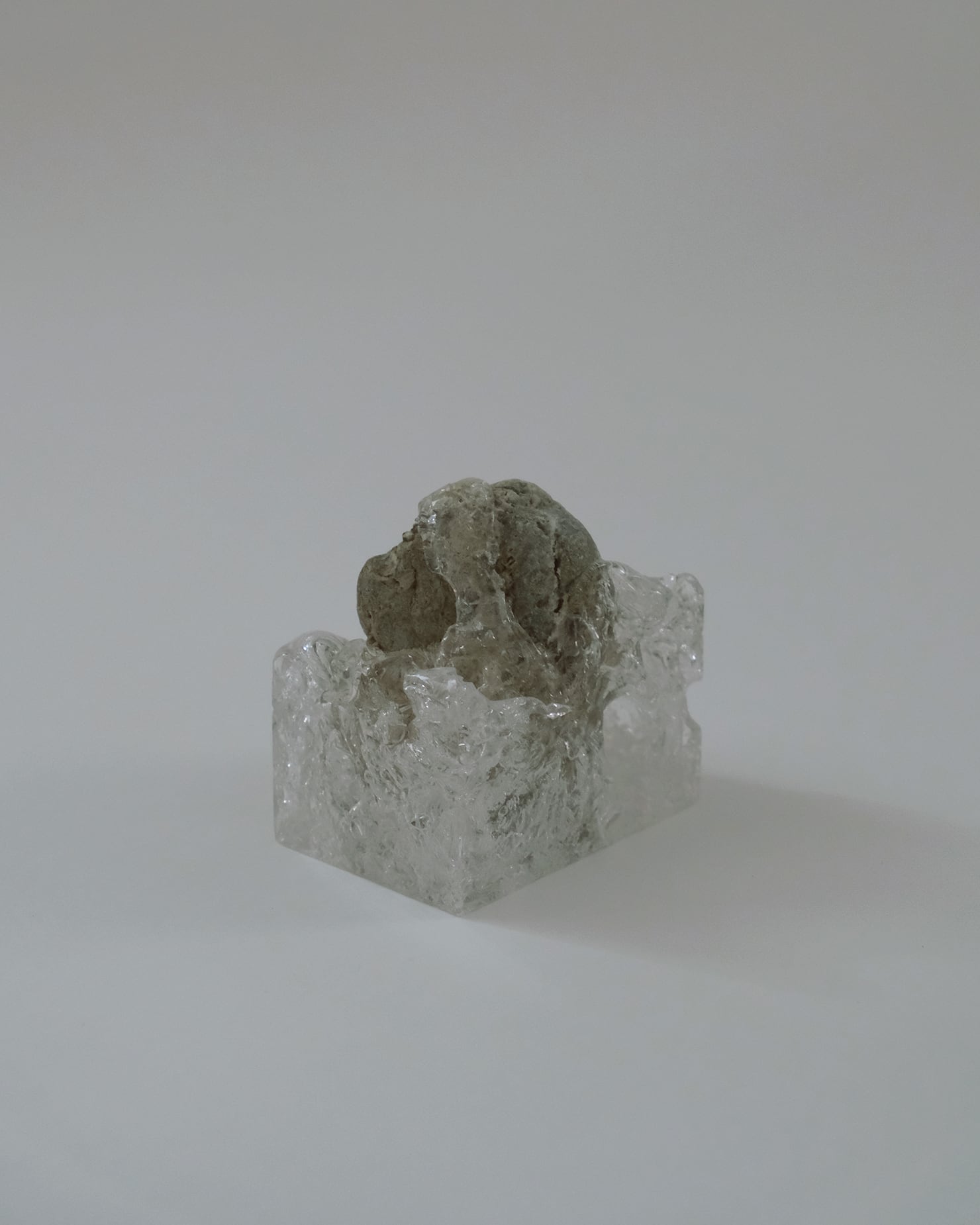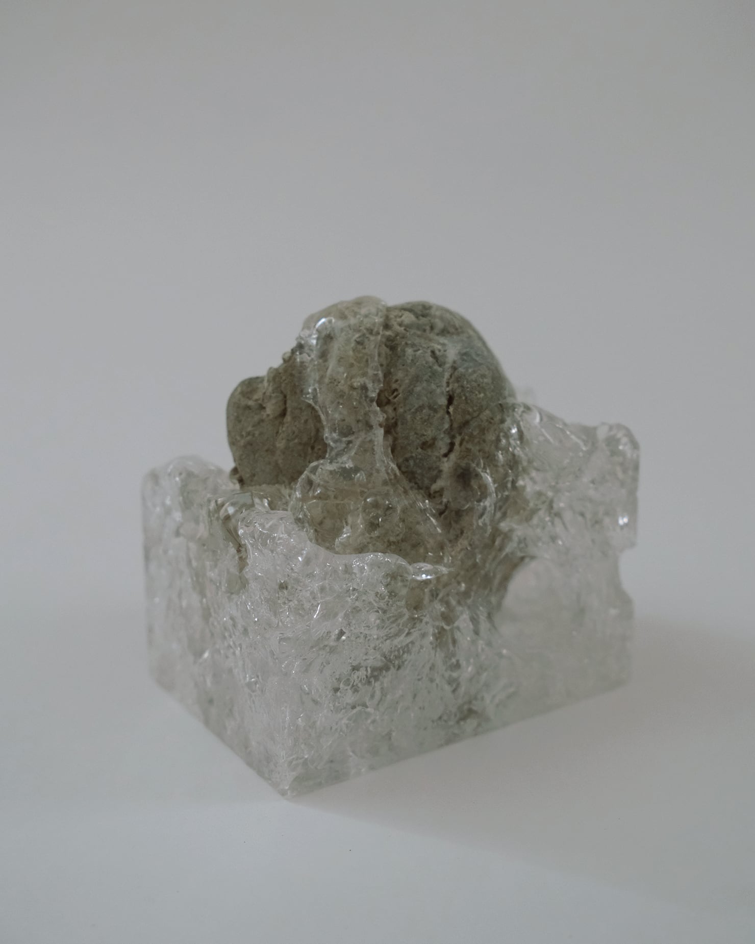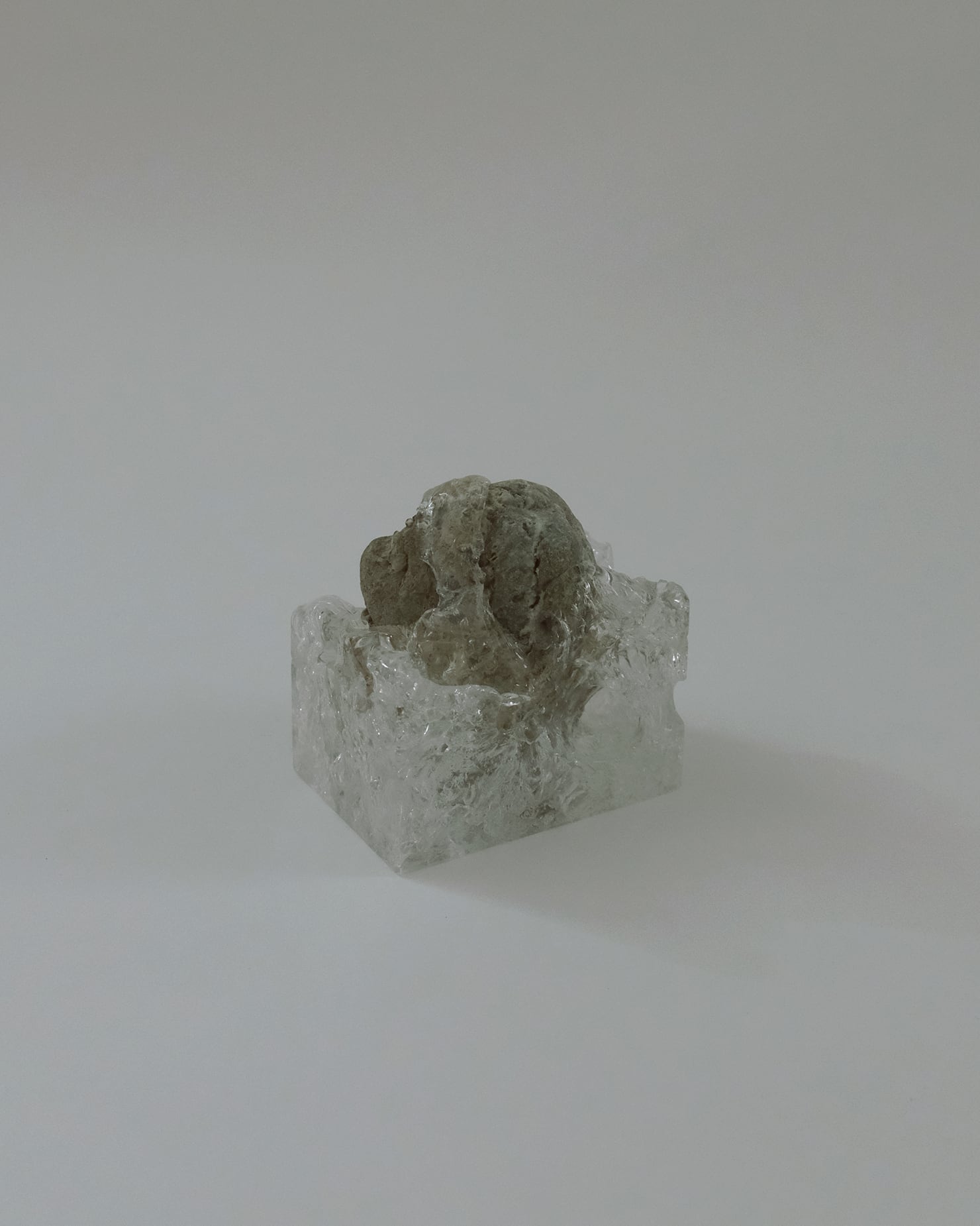 老の最大の要因にもなる空気の気泡を含んだアクリルと老ない素材とされる石が重なり、その矛盾がオブジェクトとしての魅力を作っているのかもしれません。