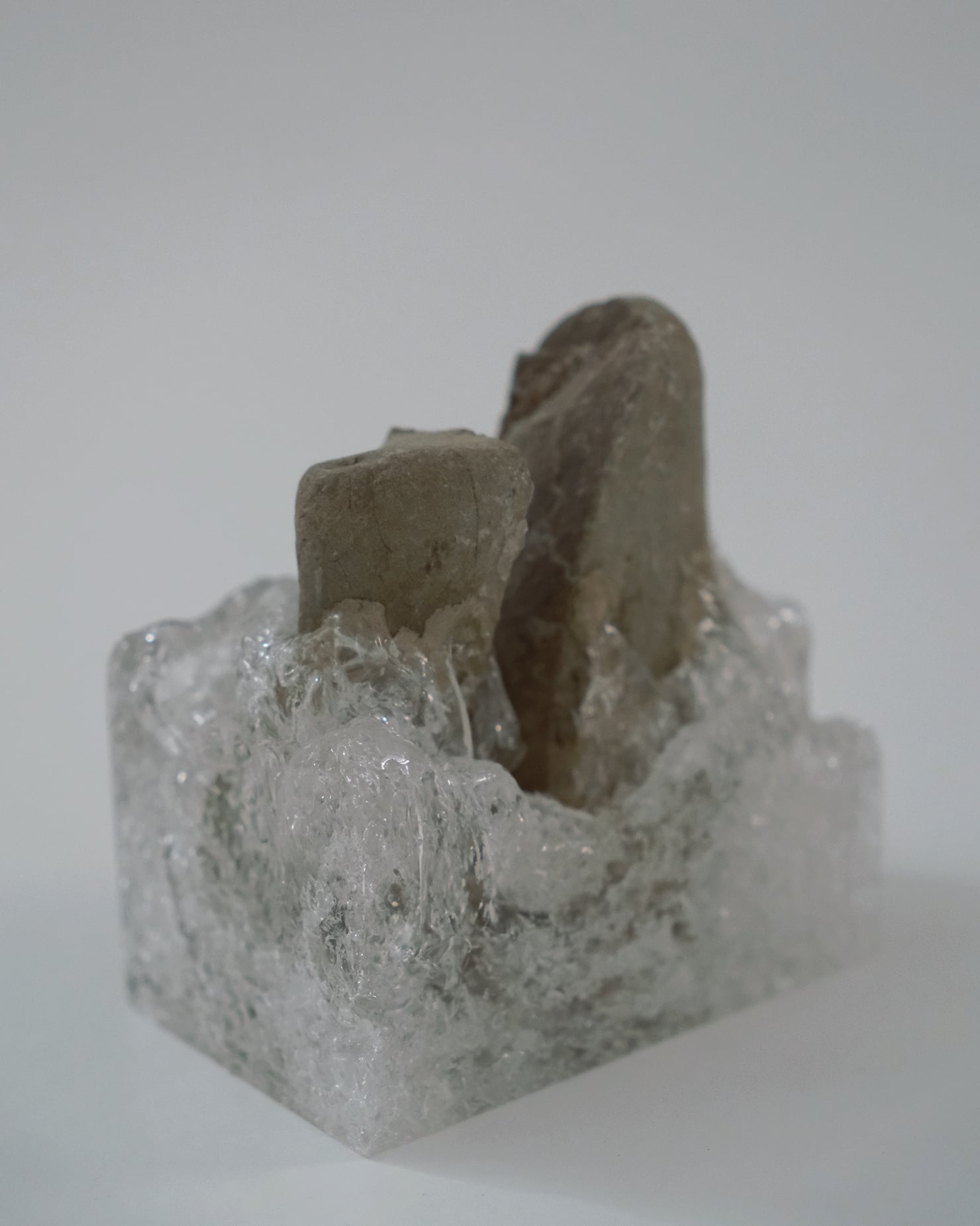 老の最大の要因にもなる空気の気泡を含んだアクリルと老ない素材とされる石が重なり、その矛盾がオブジェクトとしての魅力を作っているのかもしれません。