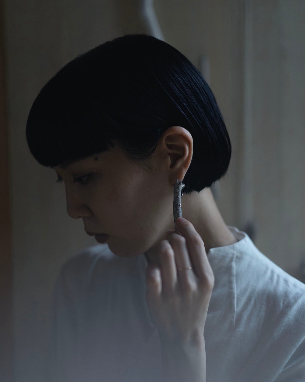 無くなった枝先の形を想像して、七宝で継ぐようにして作られたイヤリング。七宝による少しの重たさが耳元で存在を語ります。