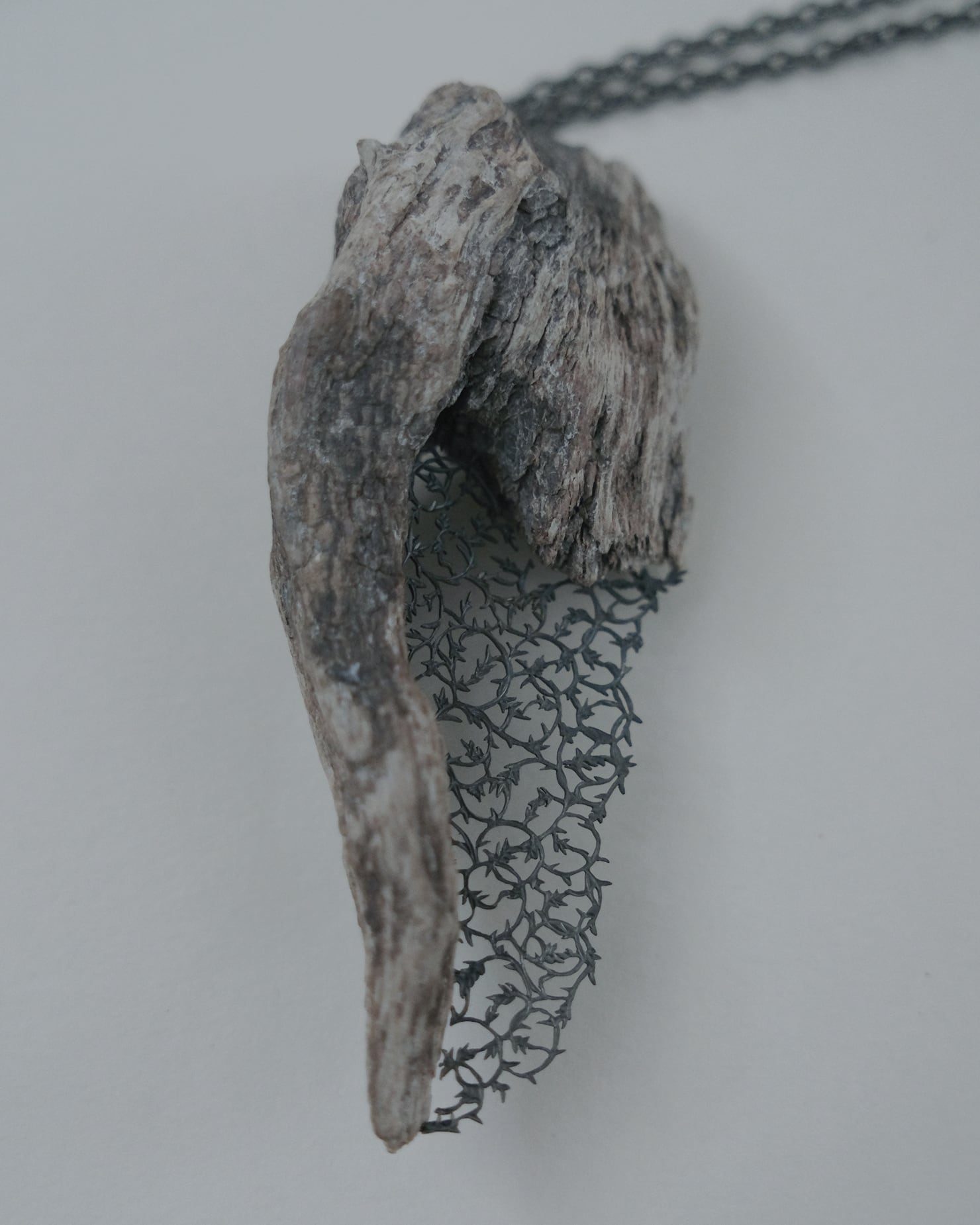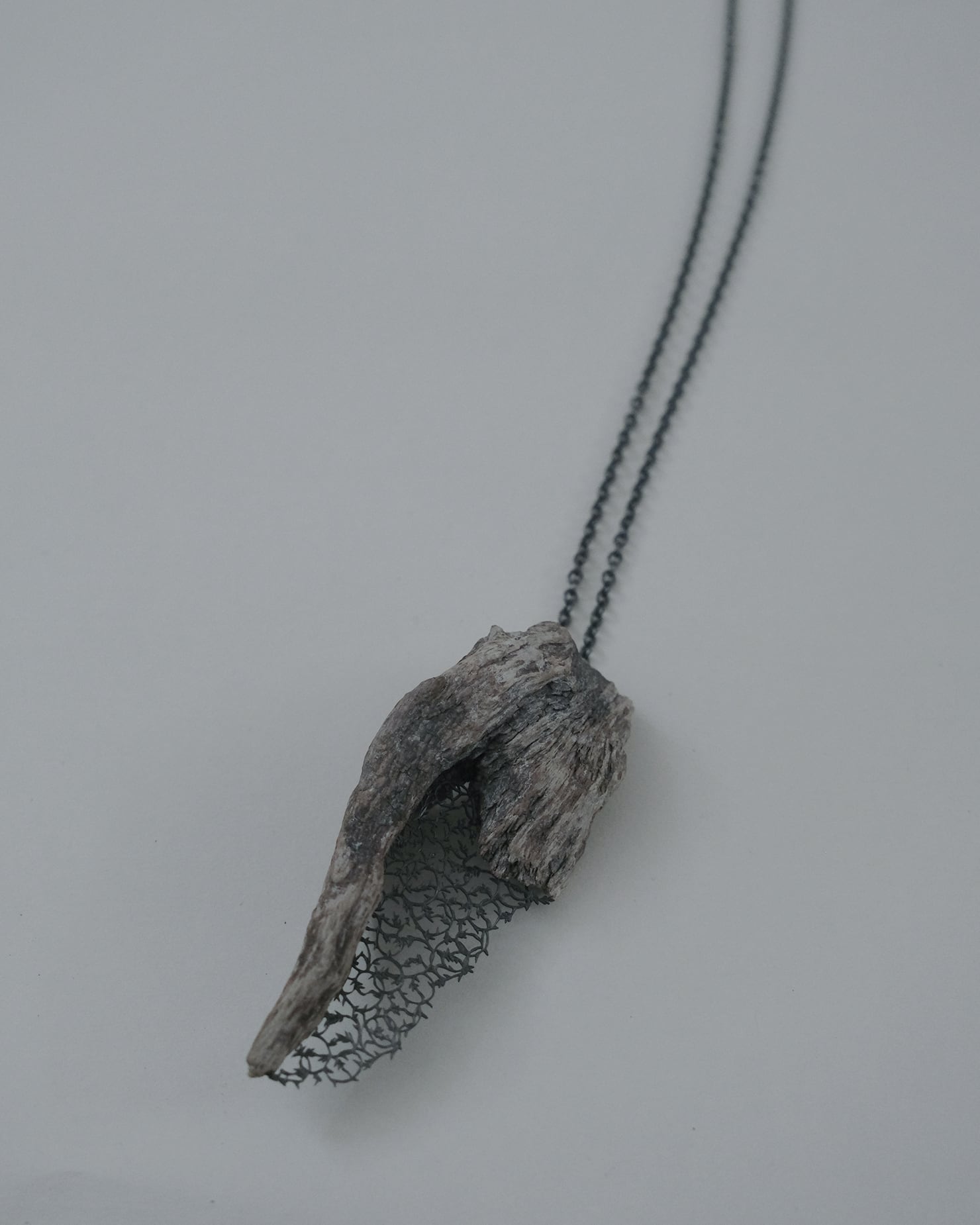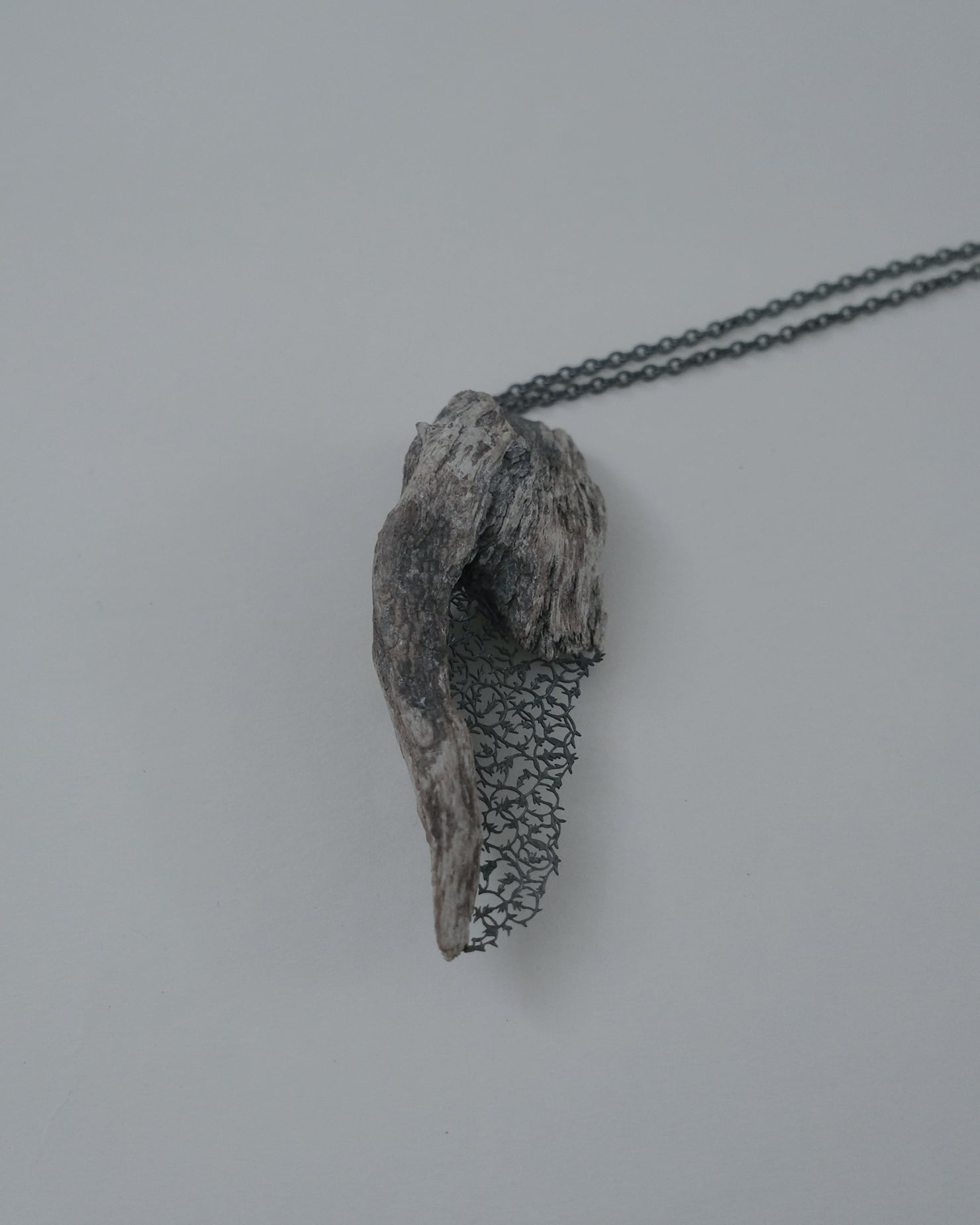 流木の形を継ぐように編まれた銀が羽のような繊細な美しさを作るネックレス