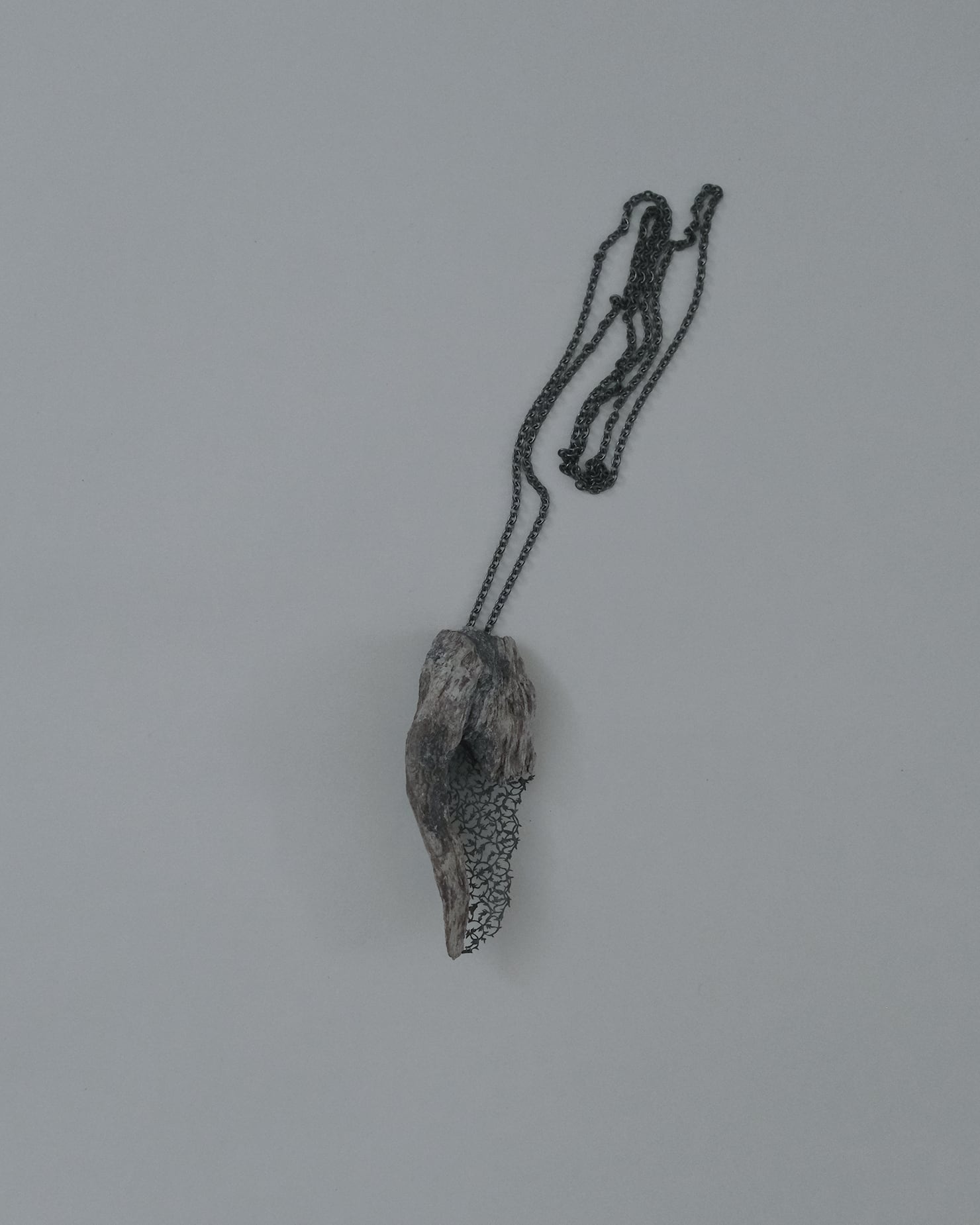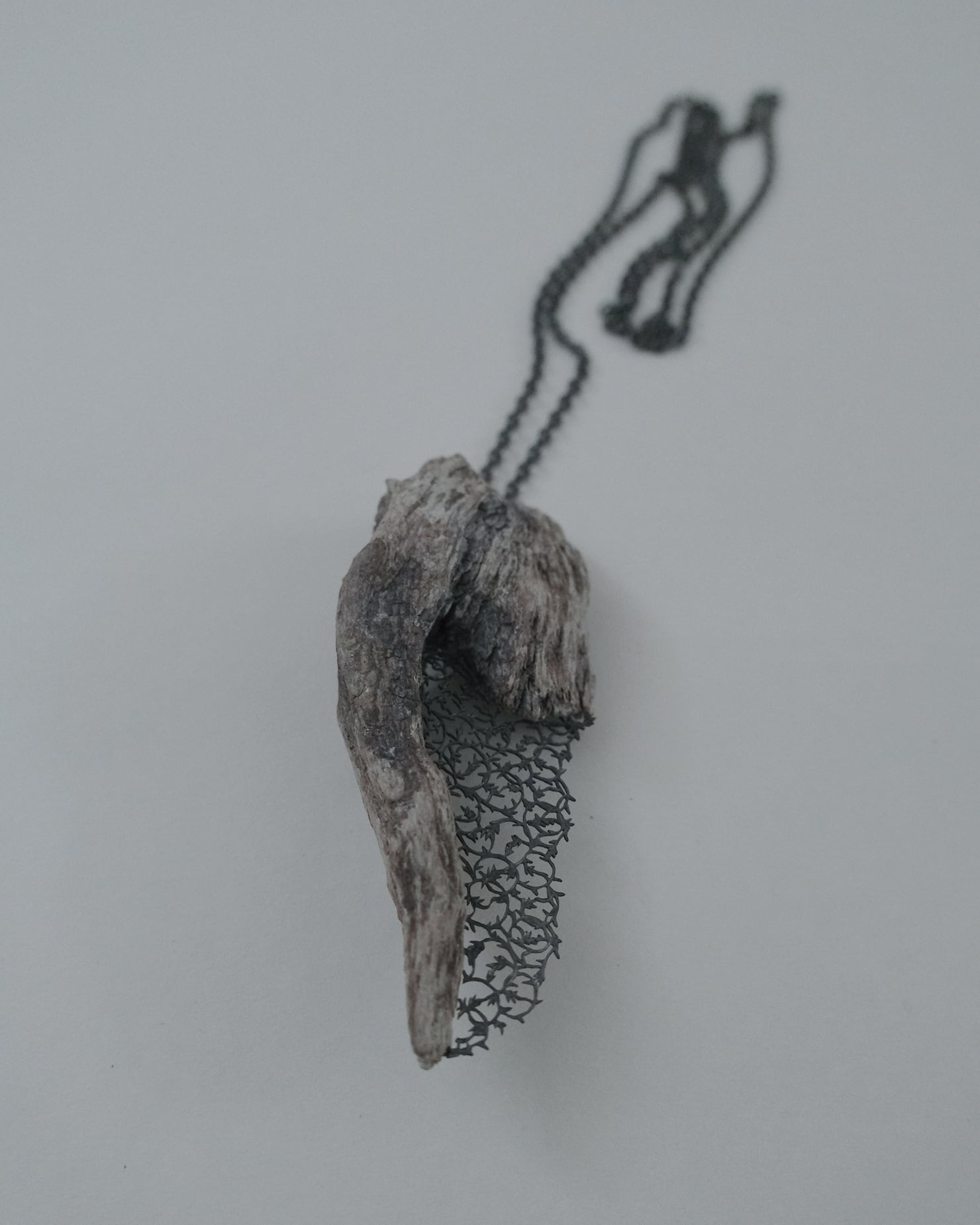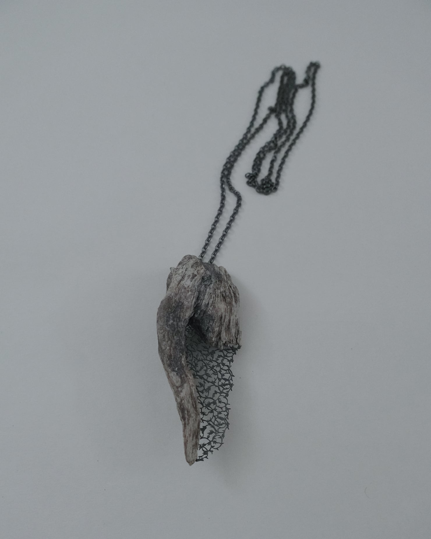 流木の形を継ぐように編まれた銀が羽のような繊細な美しさを作るネックレス