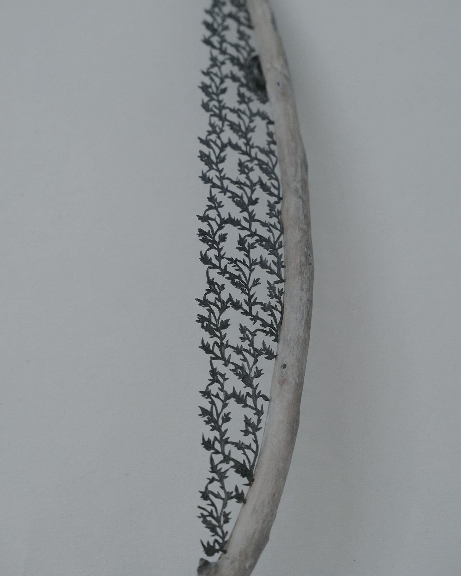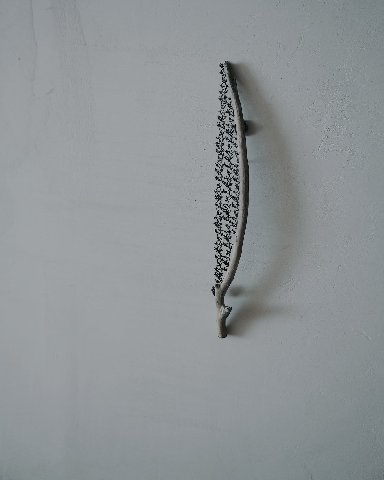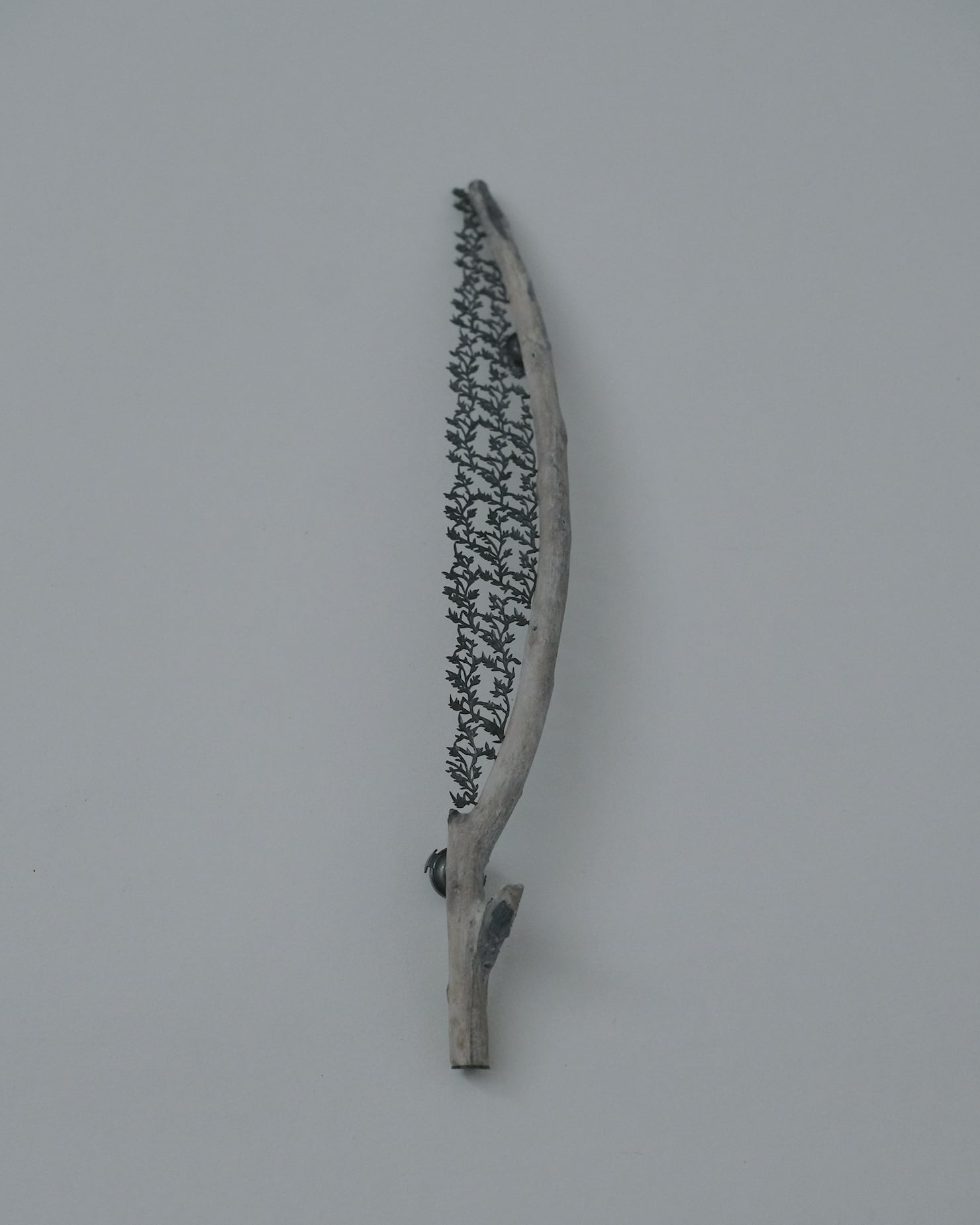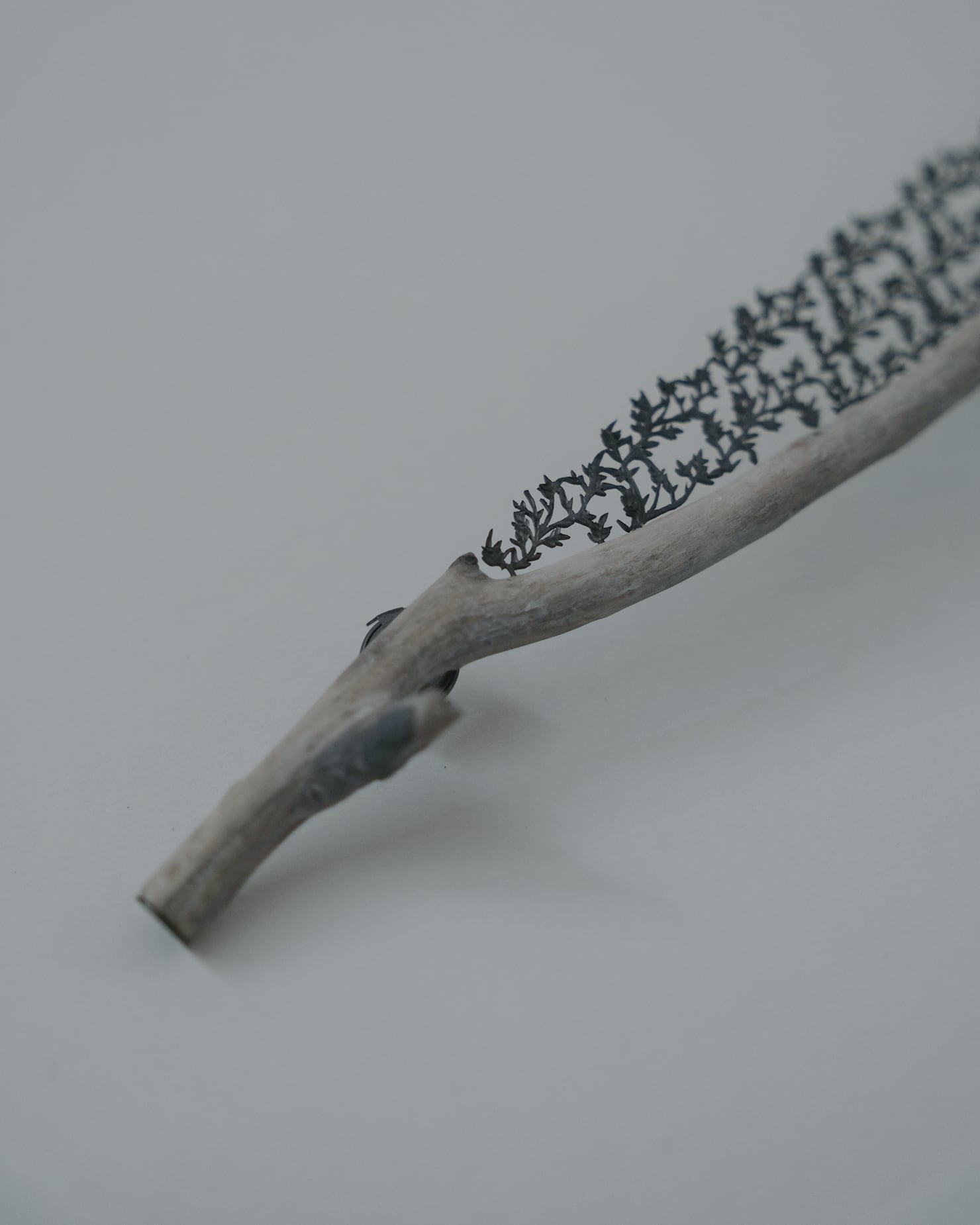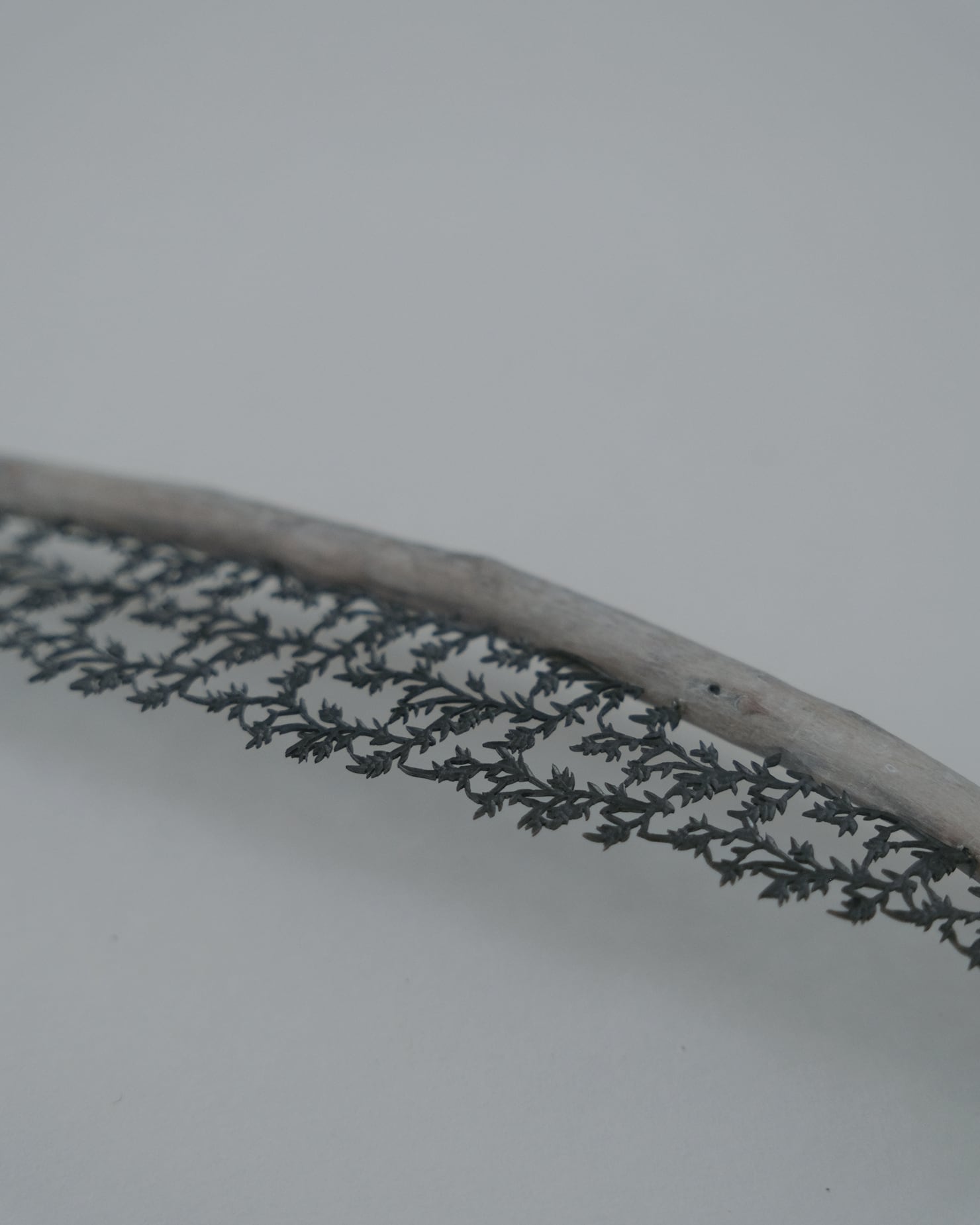 流木が抱える莫大な記憶や痕跡を想像しながら編むようにして重ねられた銀の装飾は、その技術力の高さが人工物の領域を超越し、自然物への交わりを許すようにも感じさせます。