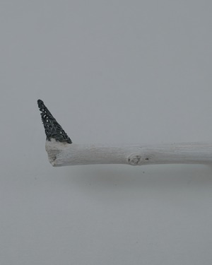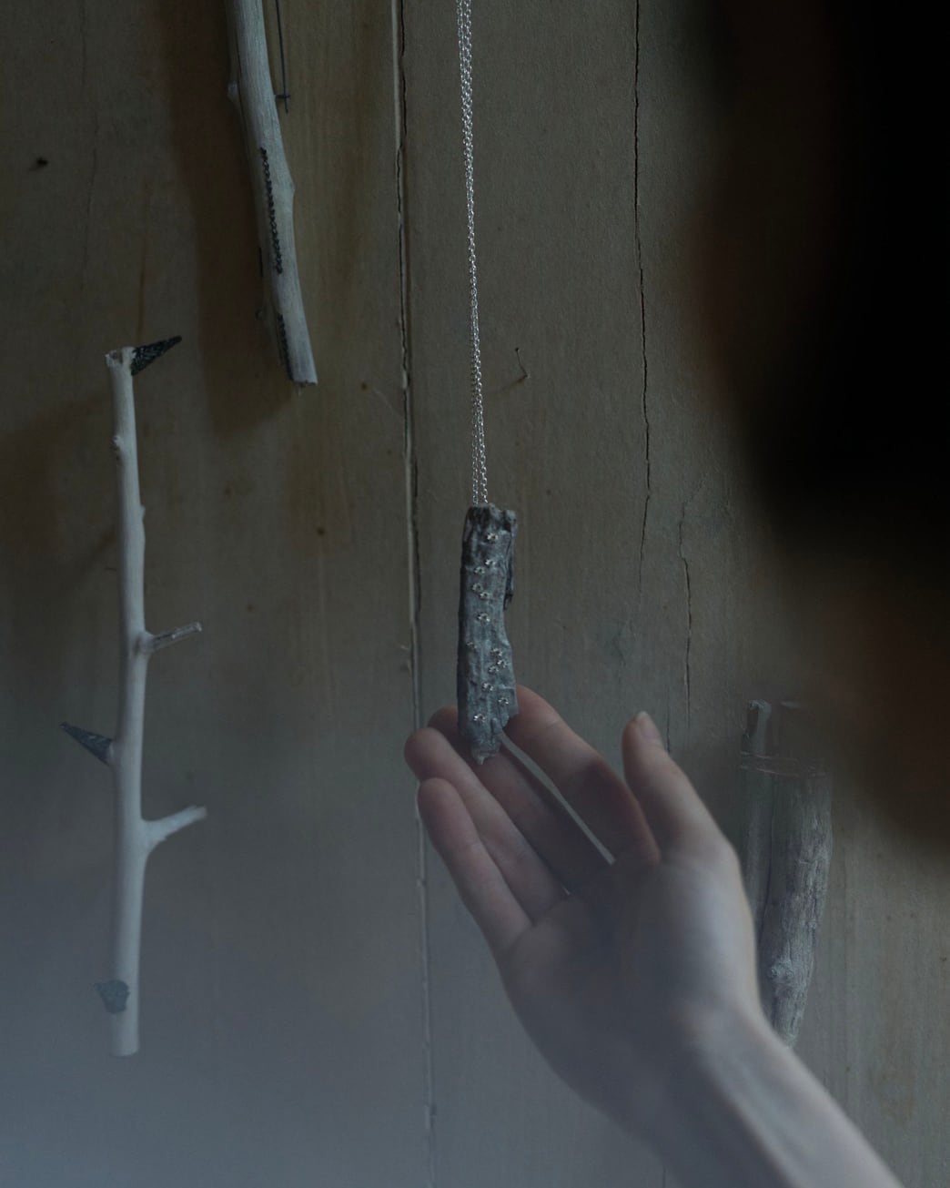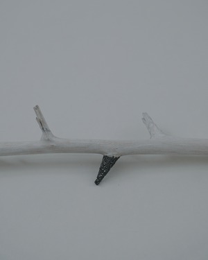 無くなった枝先の形を想像して、継ぐようにして銀で形作られた装飾が流木に新しい息吹を与えるかのように見えるブローチ。それはまるで誰も傷つけることのない優しい棘のよう。胸元で、壁にかけても、唯一無二の存在として光ります。
