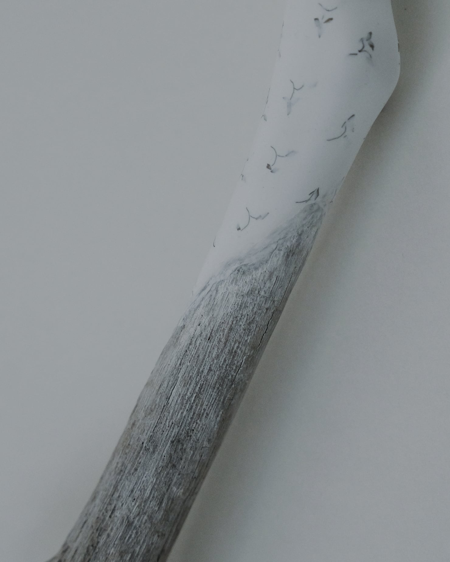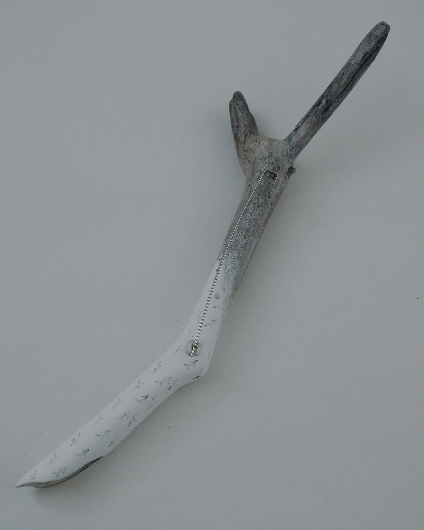 流木が抱える莫大な記憶や痕跡を想像しながら編むようにして重ねられた銀の装飾は、その技術力の高さが人工物の領域を超越し、自然物への交わりを許すようにも感じさせます。
