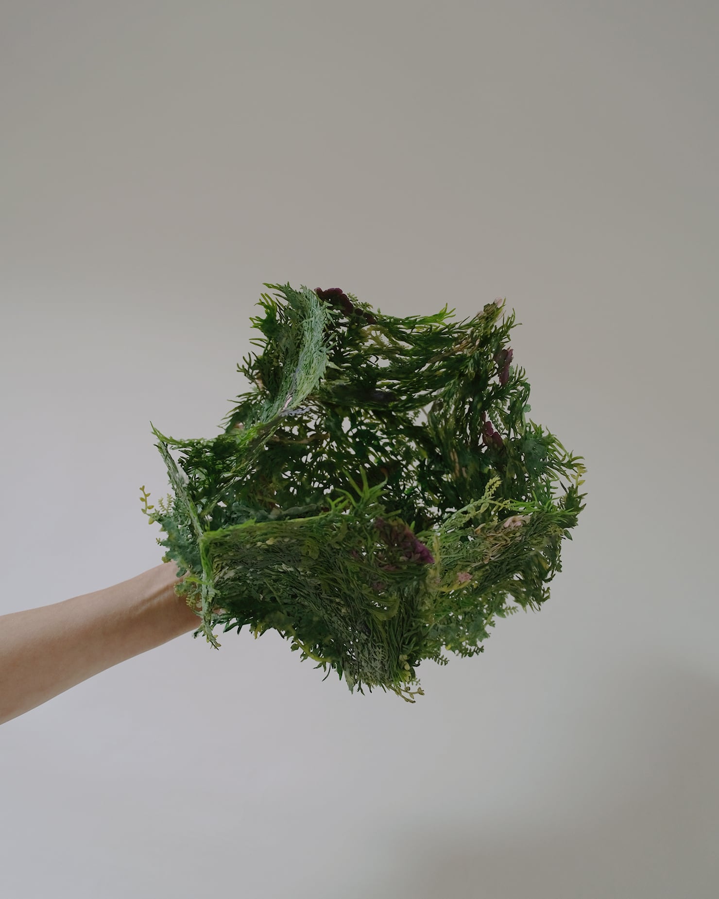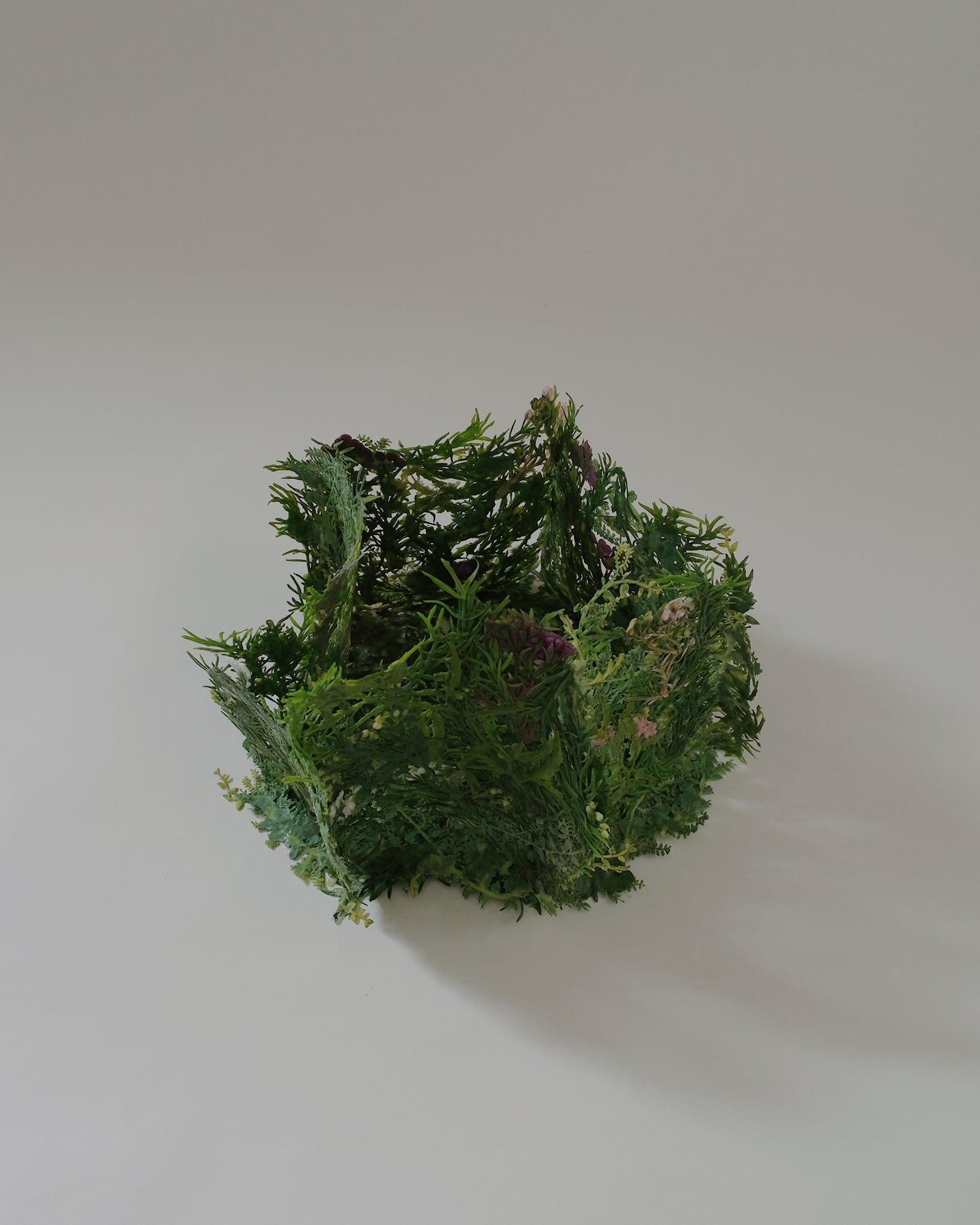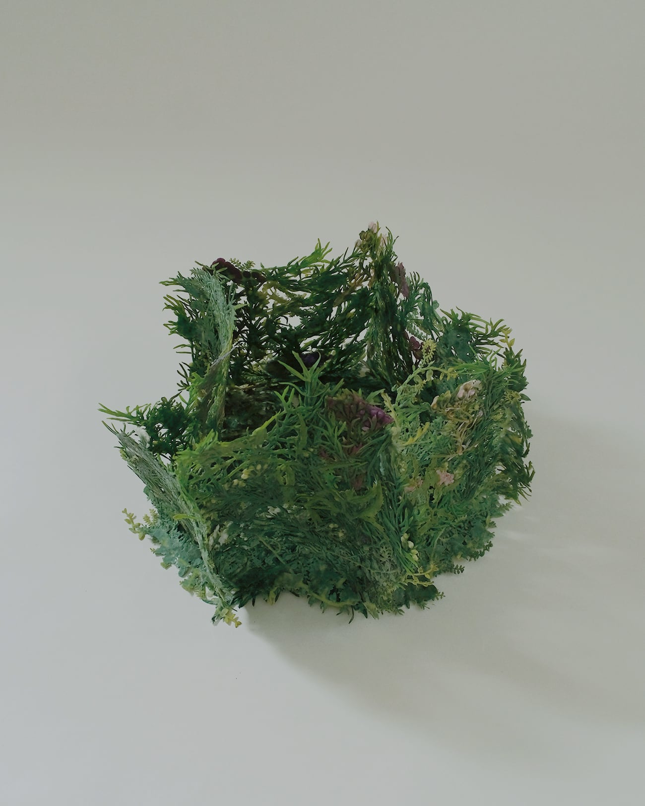 人が木の枝や藁、葉や蔓で編んだことに始まる籠やトレイ。もしもそれらが人工植物でつくられていたら。その形をつくるにあたり熱圧着された様子はウィットに富み、そのものの本質を見せられるようで、みていて飽きません。