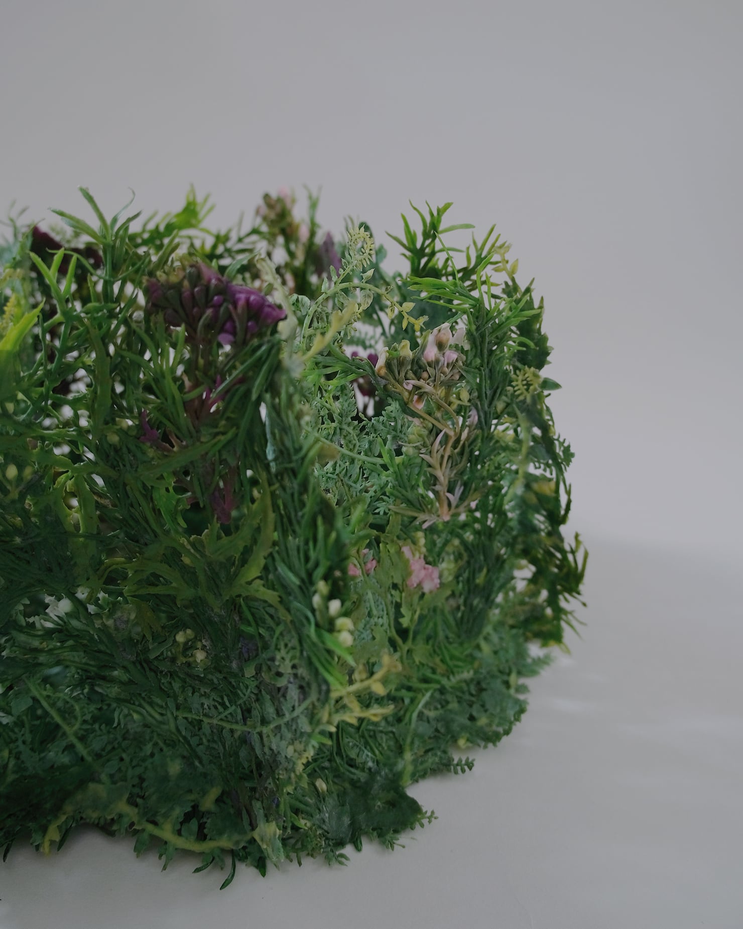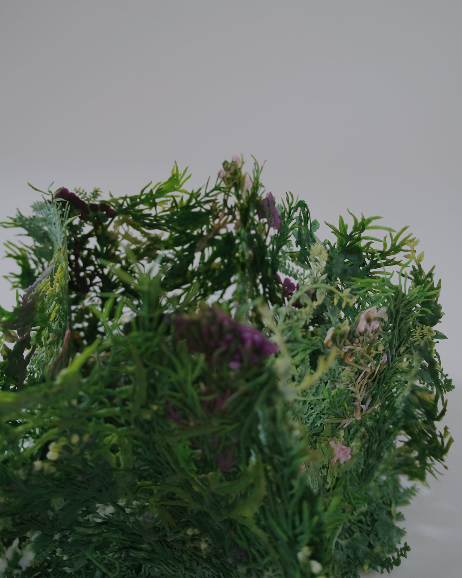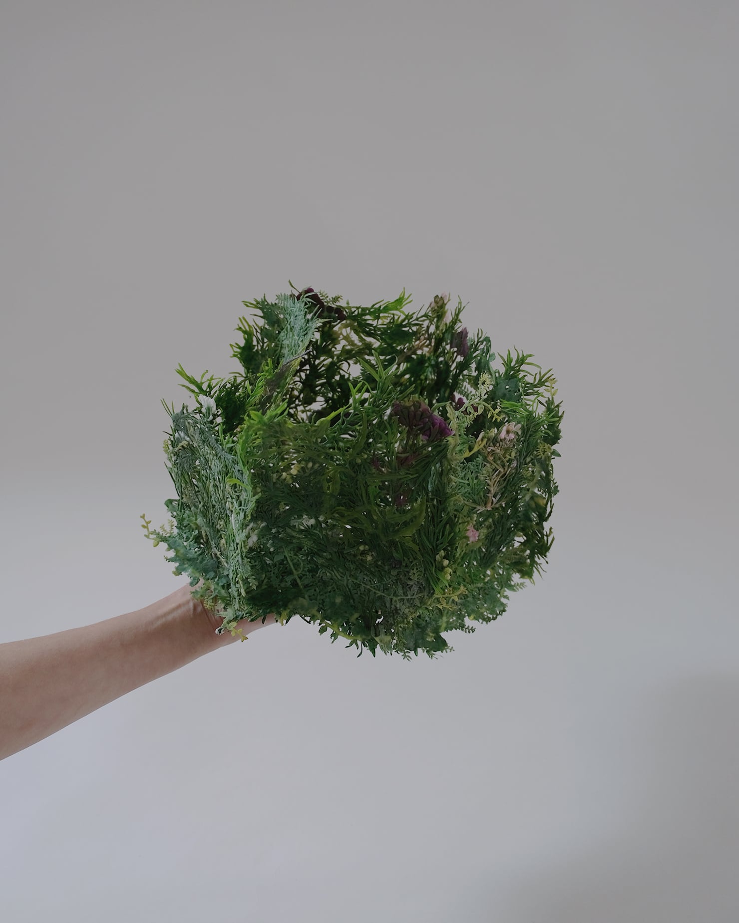 人が木の枝や藁、葉や蔓で編んだことに始まる籠やトレイ。もしもそれらが人工植物でつくられていたら。その形をつくるにあたり熱圧着された様子はウィットに富み、そのものの本質を見せられるようで、みていて飽きません。