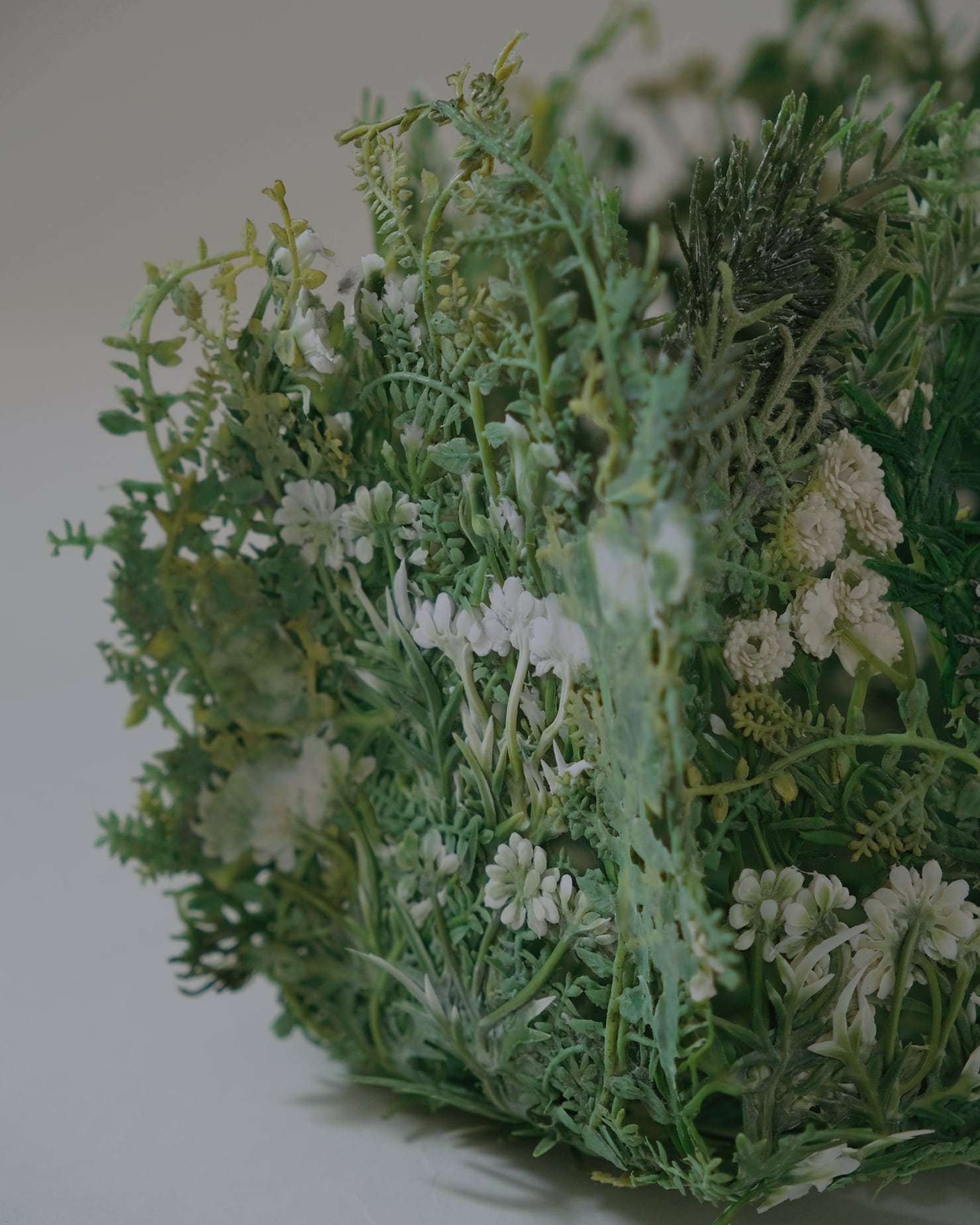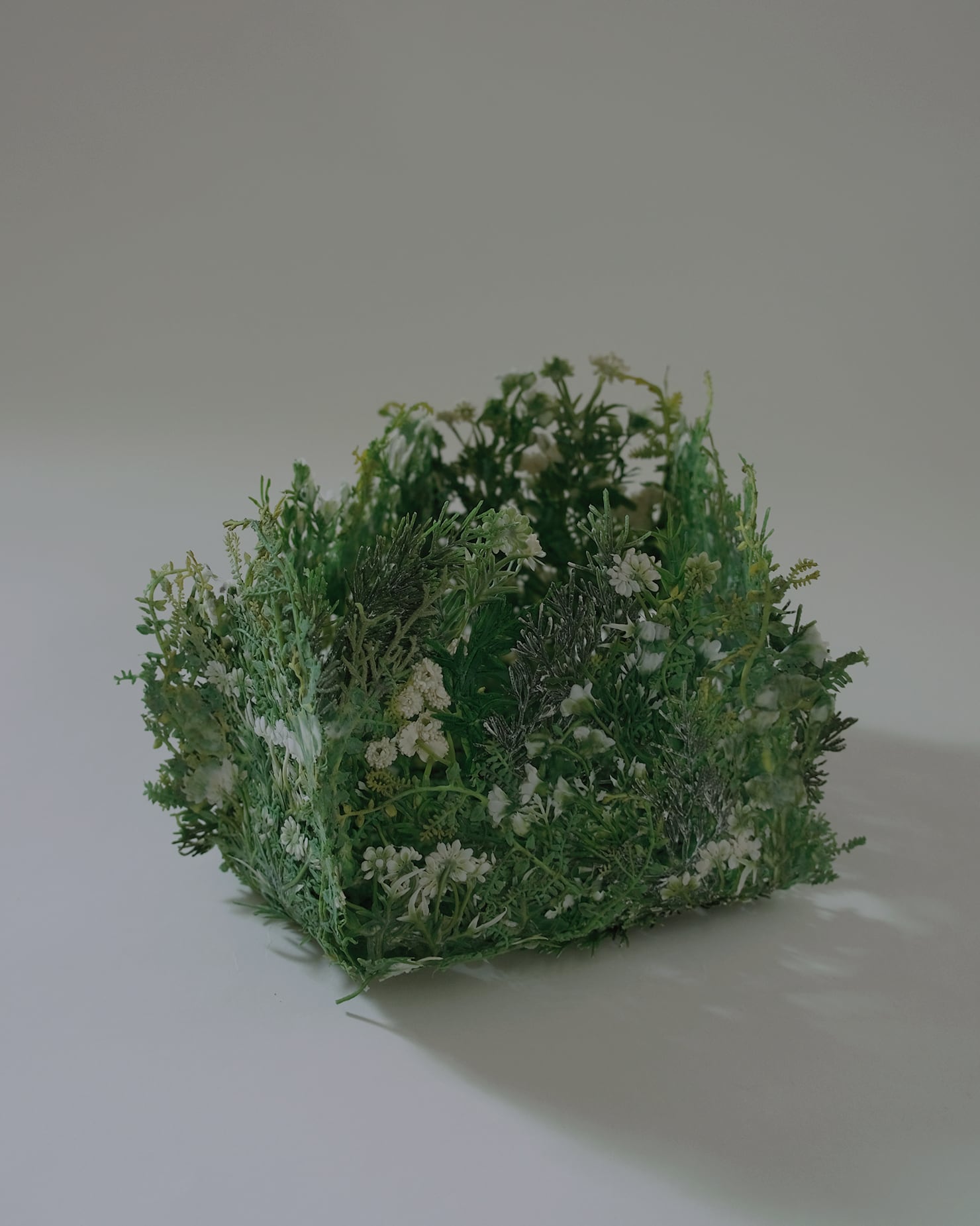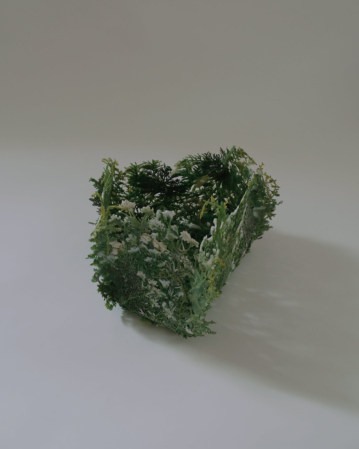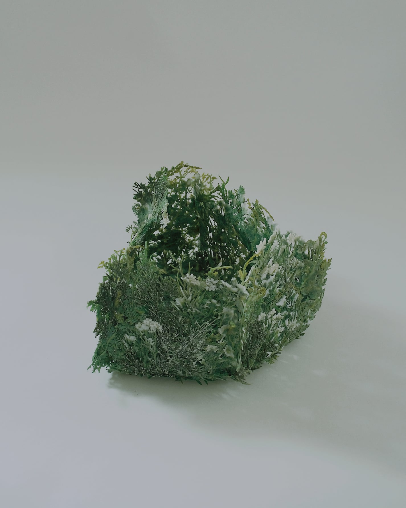 人が木の枝や藁、葉や蔓で編んだことに始まる籠やトレイ。もしもそれらが人工植物でつくられていたら。その形をつくるにあたり熱圧着された様子はウィットに富み、そのものの本質を見せられるようで、みていて飽きません。