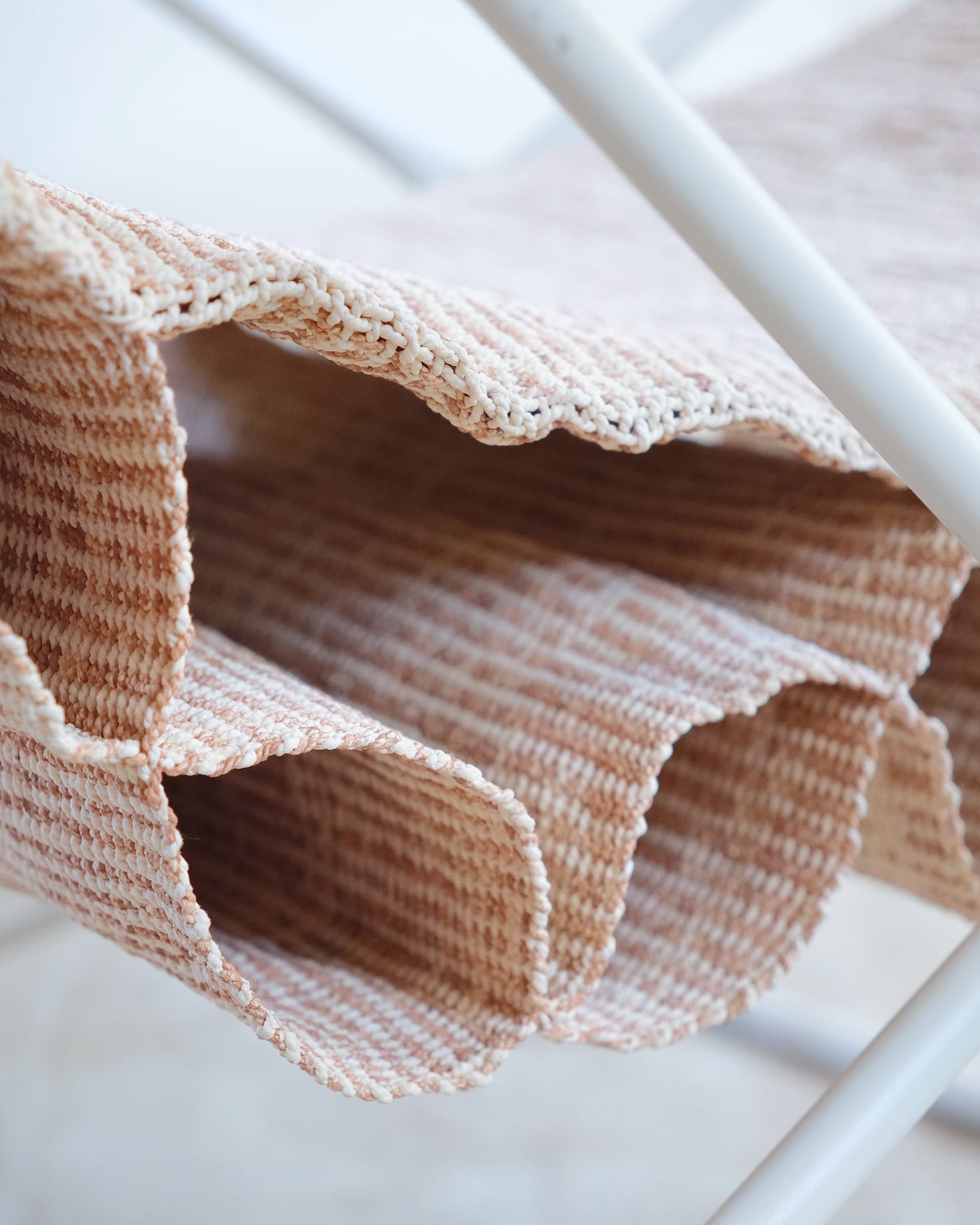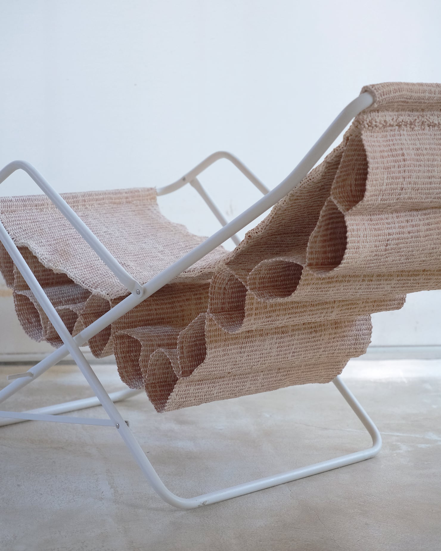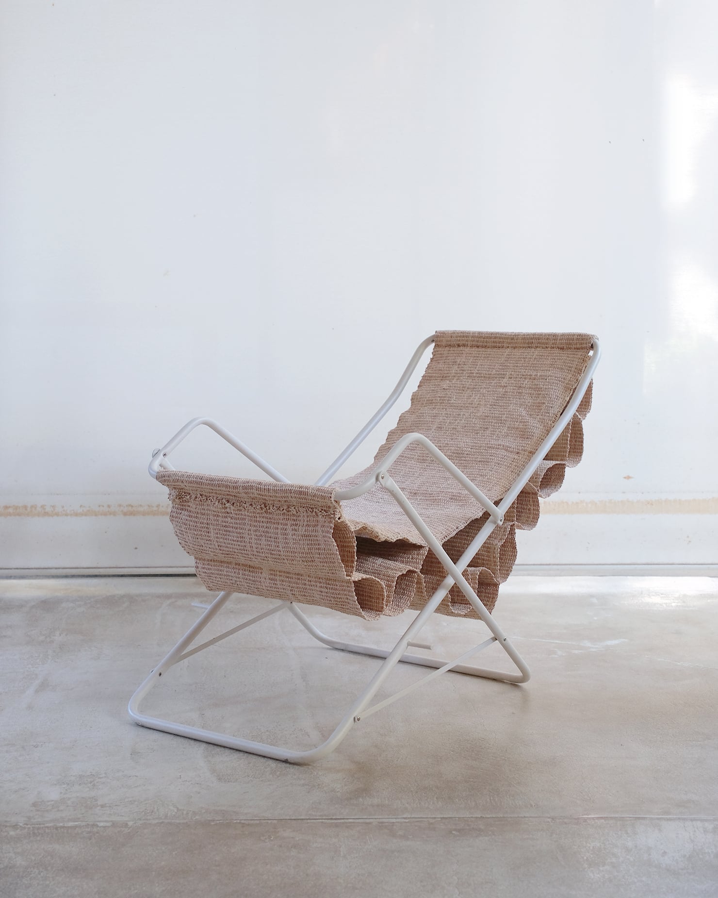 老いて朽ちた椅子の座面を仕立て直し、新しく座る景色をたのしむプロジェクト「織座す(おはす)」。あわいもんが収集した朽ちた古家具にテキスタイルアーティストの肥田野優希が“座”を織り重ねてあたらしい“椅子”をつくる取り組みです。