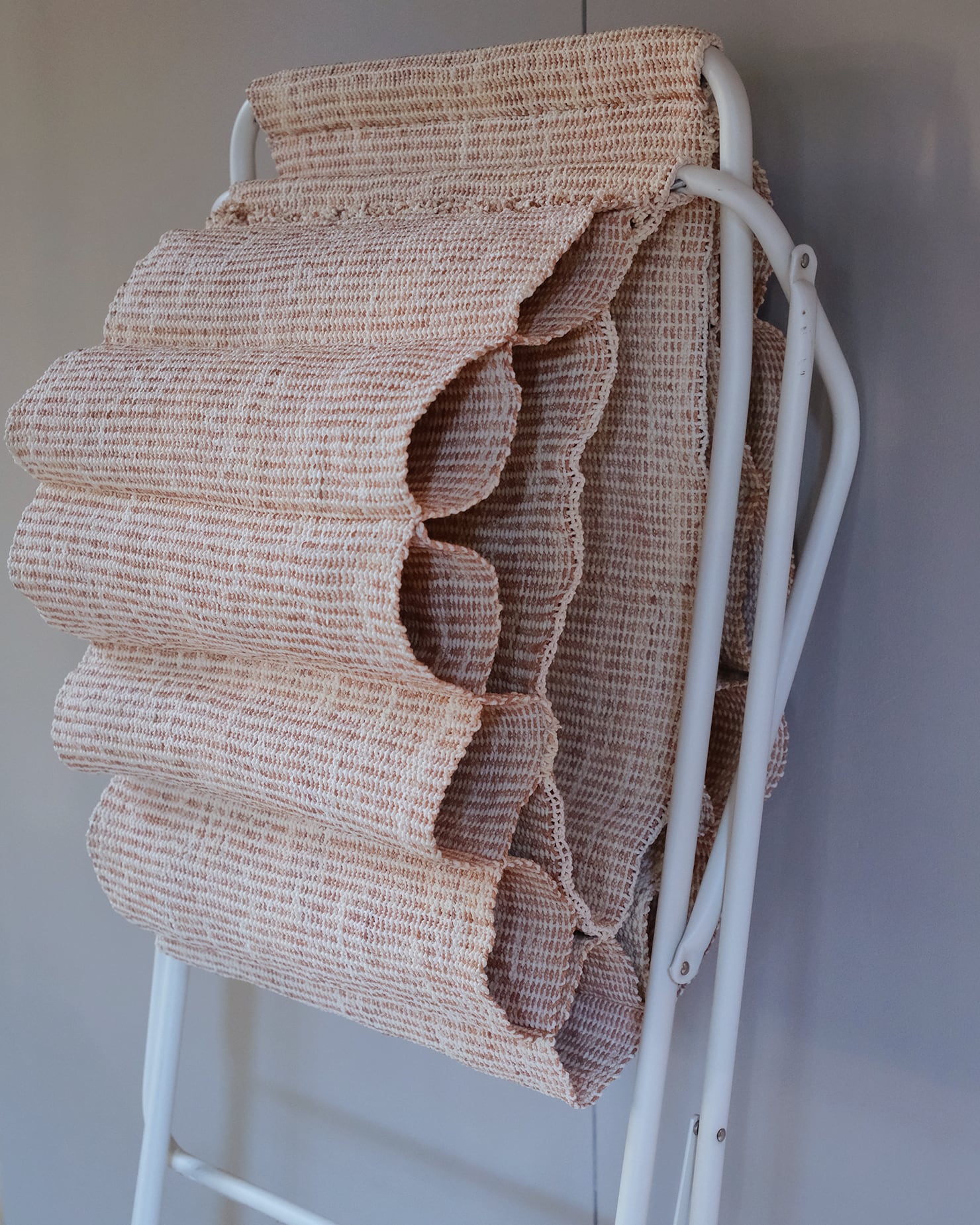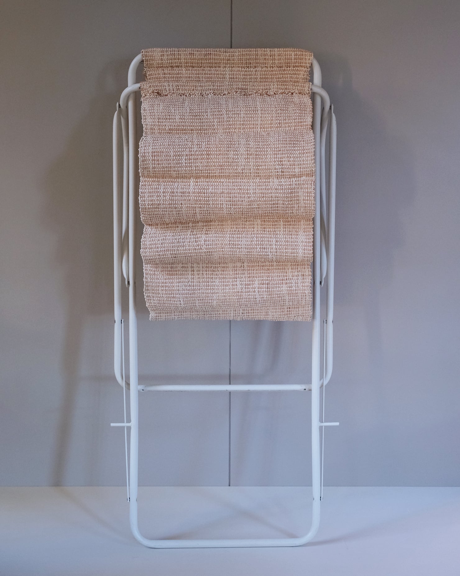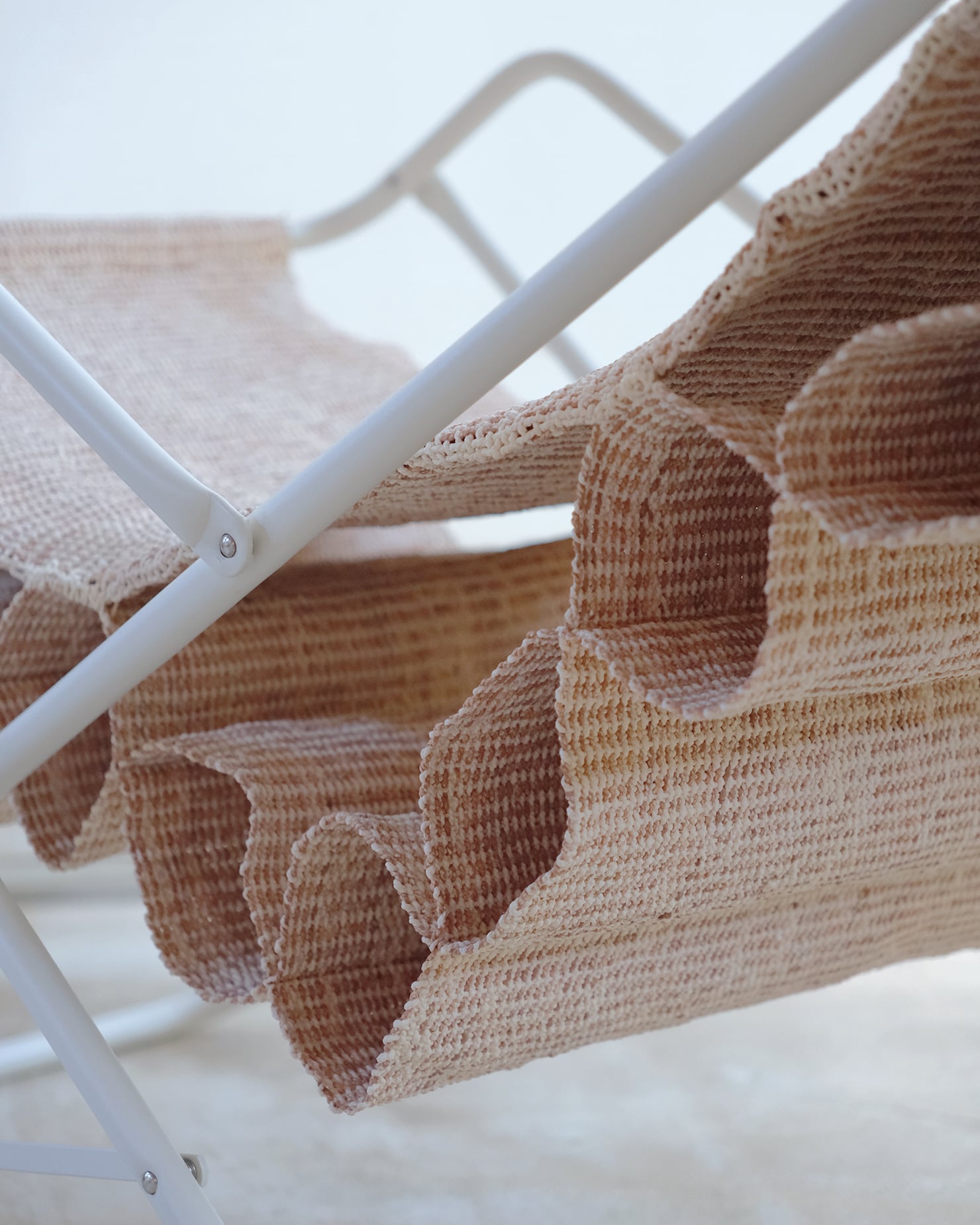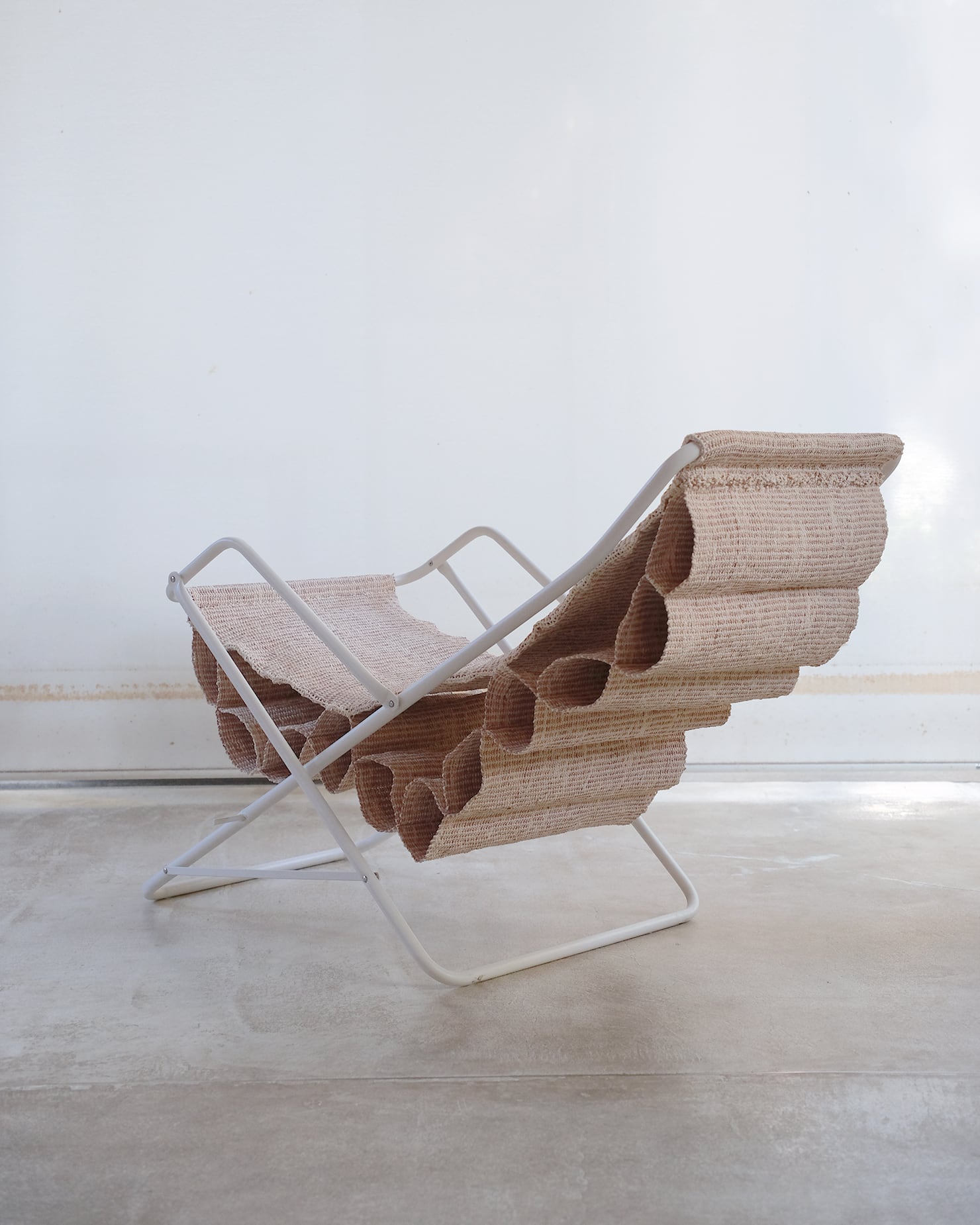 老いて朽ちた椅子の座面を仕立て直し、新しく座る景色をたのしむプロジェクト「織座す(おはす)」。あわいもんが収集した朽ちた古家具にテキスタイルアーティストの肥田野優希が“座”を織り重ねてあたらしい“椅子”をつくる取り組みです。